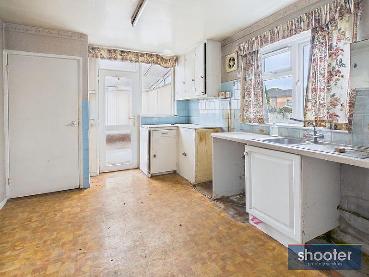 High and low level units incorporating stainless steel sink unit and space for cooker, washing machine, dishwasher and fridge-freezer. Extractor fan. Vinyl floor and part tiled walls. Storage cupboard off.