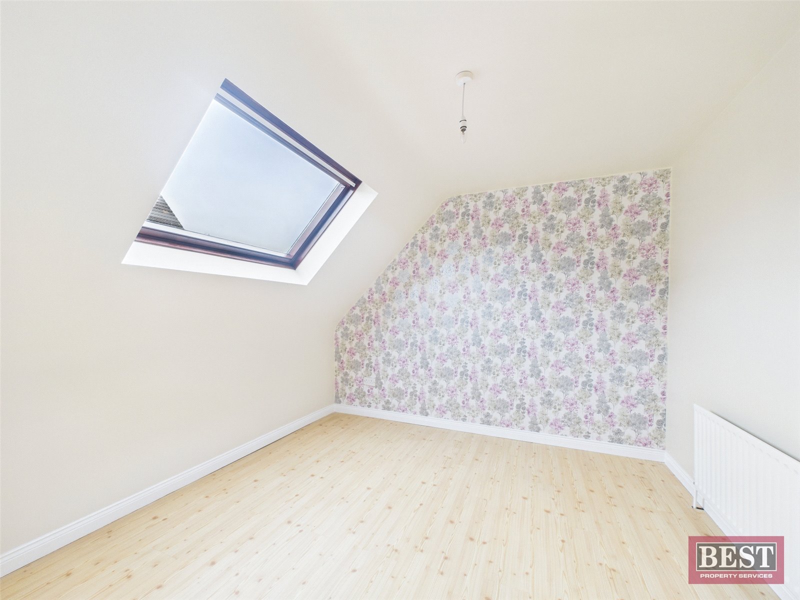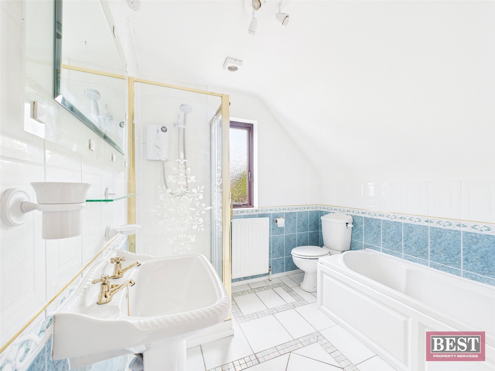Upstairs, there are three well-proportioned bedrooms, all finished with laminate flooring. The family bathroom is fully tiled and fitted with a modern white suite including bath, WC, wash hand basin, and a separate shower cubicle with electric shower. The landing provides access to the roof space, a hotpress, and an additional storage cupboard.