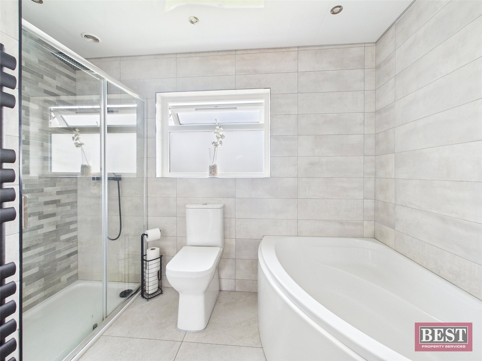 Upstairs, the first-floor landing provides access to four well-proportioned bedrooms, each finished with laminate or carpet flooring and traditional ceiling coving with roses and picture rails, adding character throughout. The principal bedroom to the front benefits from a bank of built-in wardrobes and a fully tiled en-suite shower room with a white suite and separate shower cubicle. The family bathroom is fitted with a white suite comprising a WC, vanity sink unit with fitted mirror, a corner bath, and a separate fully tiled shower cubicle. The roofspace is partially floored, offering excellent additional storage.