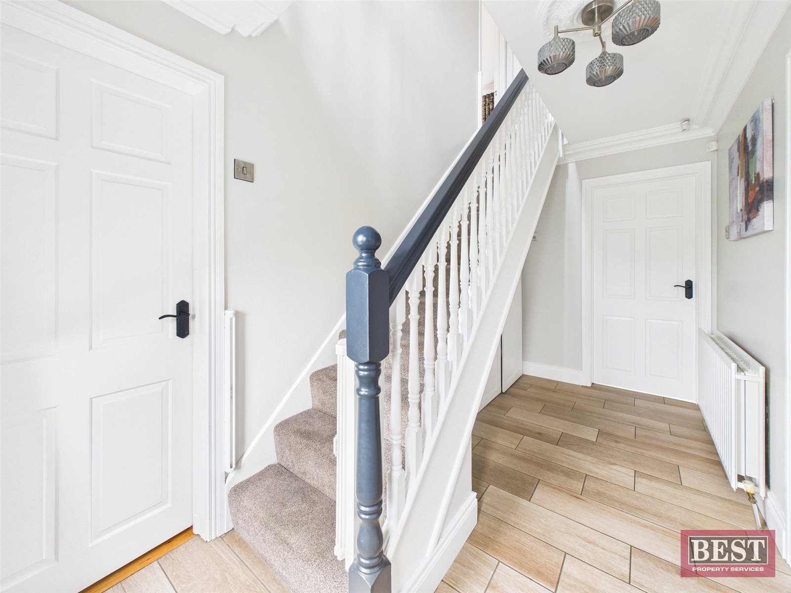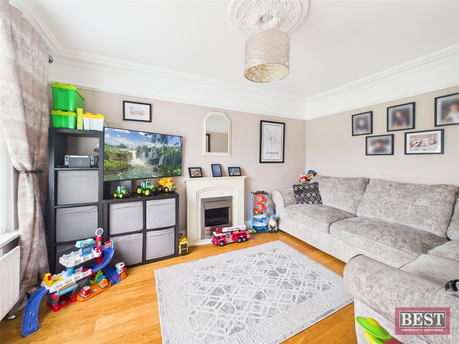 Upon entering, you are welcomed by a bright entrance hall with a tiled floor and useful freestanding understair storage. Carpeted stairs lead to the first floor. To the front of the property, the main lounge features elegant wooden flooring, a charming open fireplace, and decorative ceiling coving with a central rose - creating a warm and inviting atmosphere. Adjacent is a second reception room, also positioned to the front, with wooden flooring, a feature faux fireplace, and matching ceiling detailing, offering flexibility as an additional living space, playroom, or home office.
