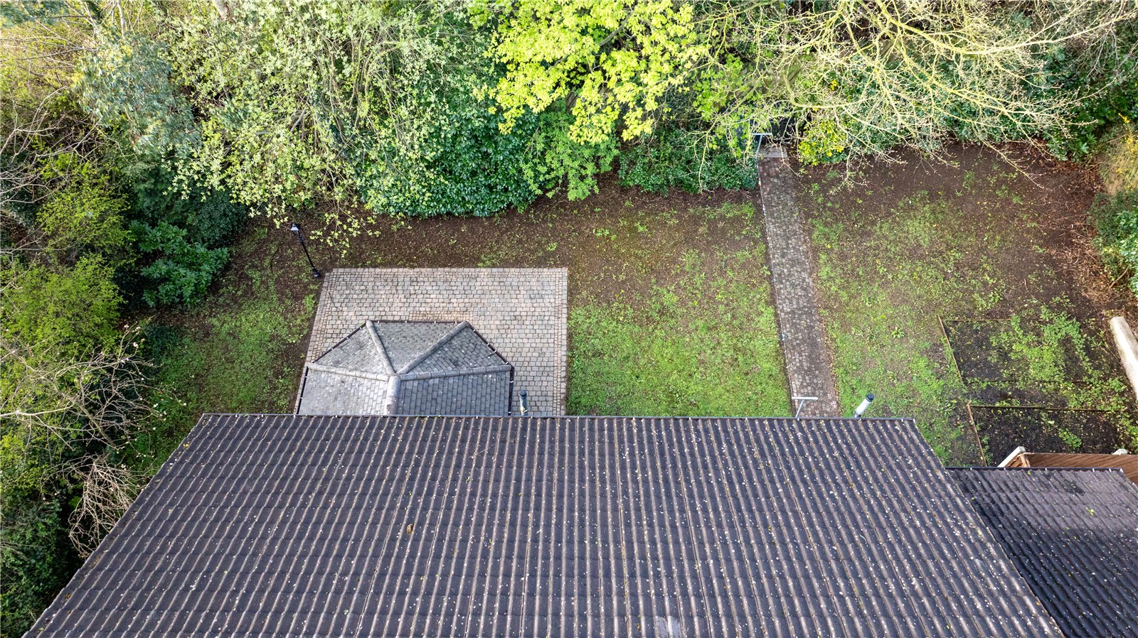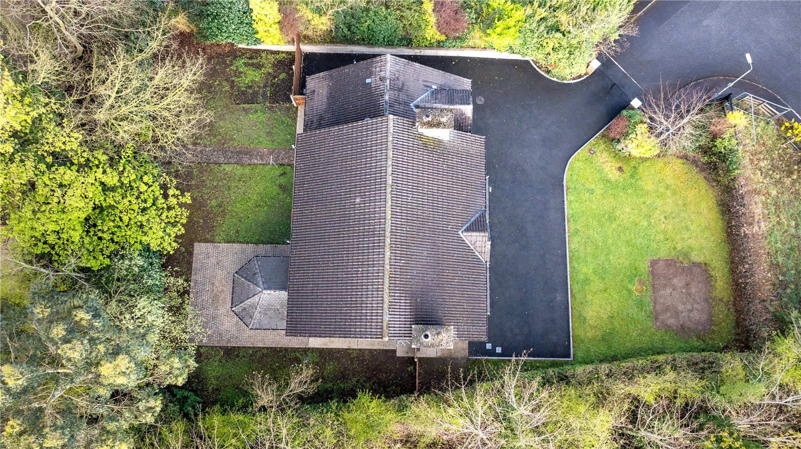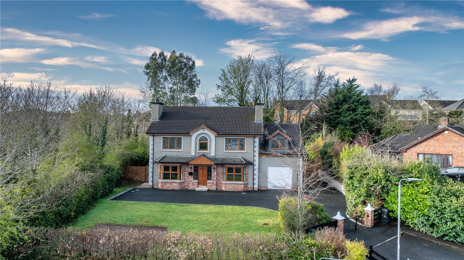 Externally, the property is set on a generous and private site. The rear garden features a paved patio area ideal for outdoor dining, with lawns extending to the rear and side, all enclosed by fencing and enhanced by mature shrubs and trees providing excellent privacy. To the front, a gated driveway offers ample parking for multiple vehicles and is complemented by a well-maintained lawn and mature planting.
