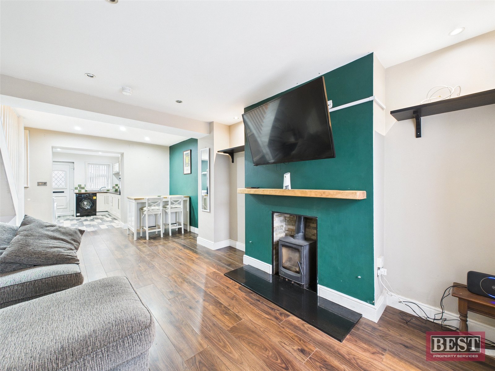 Downstairs comprises of an entrance porch, open plan spacious living room leading to the kitchen/dining area. The lounge consists of a wood burning stove with timber flooring. Kitchen/dining area has a good range of high & low-level units and integrated hob and oven with plumbing for a washing machine. On the first floor there are two well-proportioned bedrooms and a family bathroom consisting of a three piece suite with a separate fully tiled shower cubicle with electric shower.