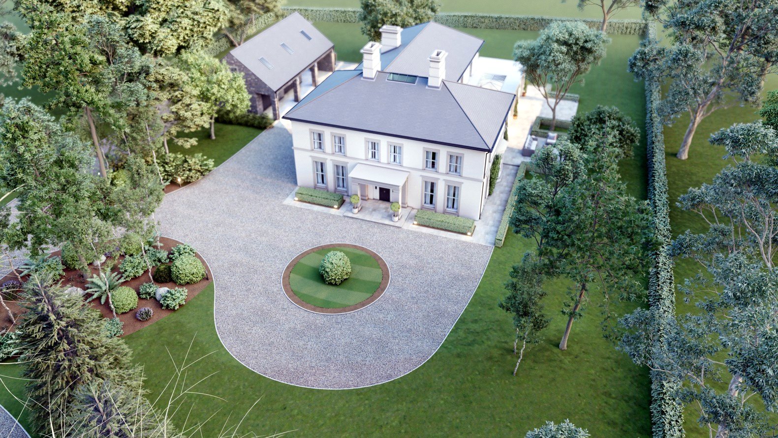 The approved house type is for an impressive two-storey detached residence with garage, similar in style and scale to the property illustrated, featuring a traditional yet elegant design that sits comfortably within its rural surroundings.