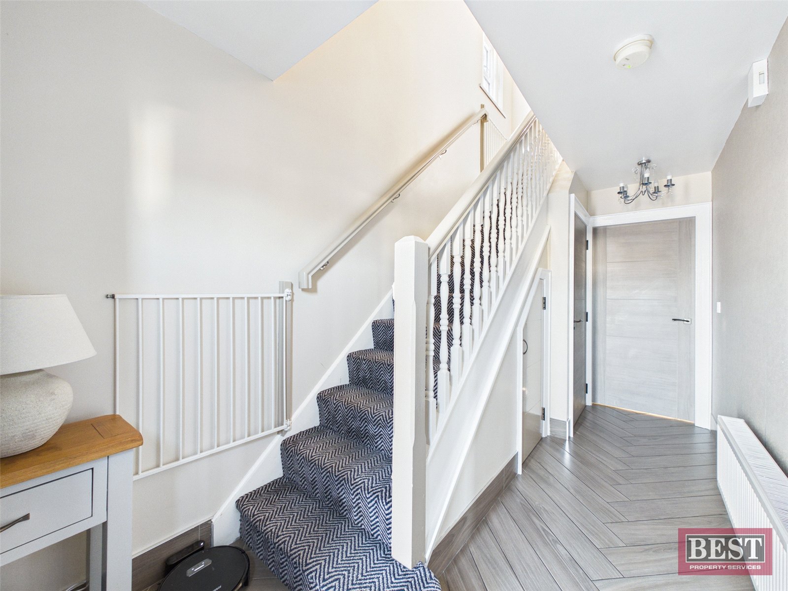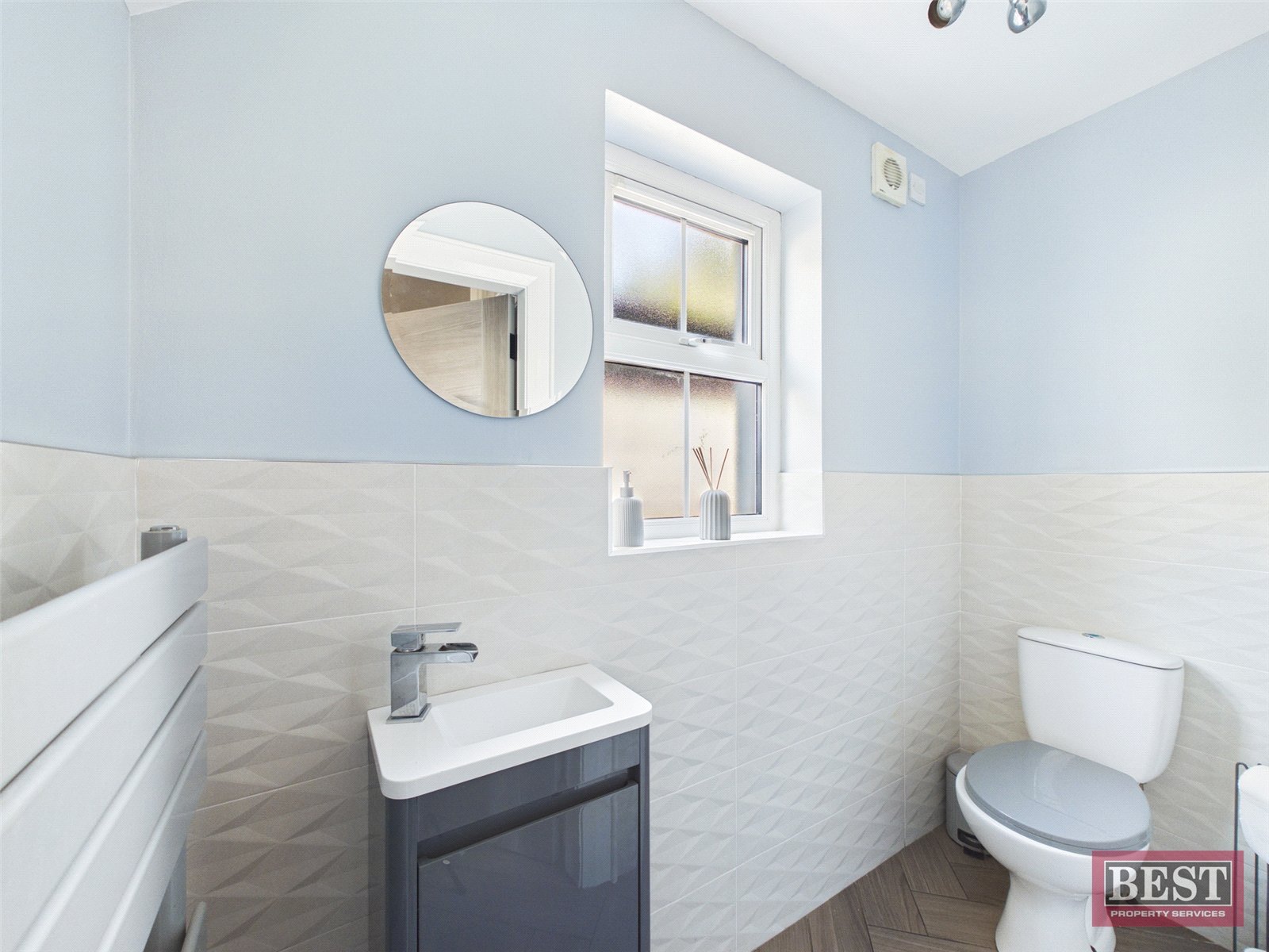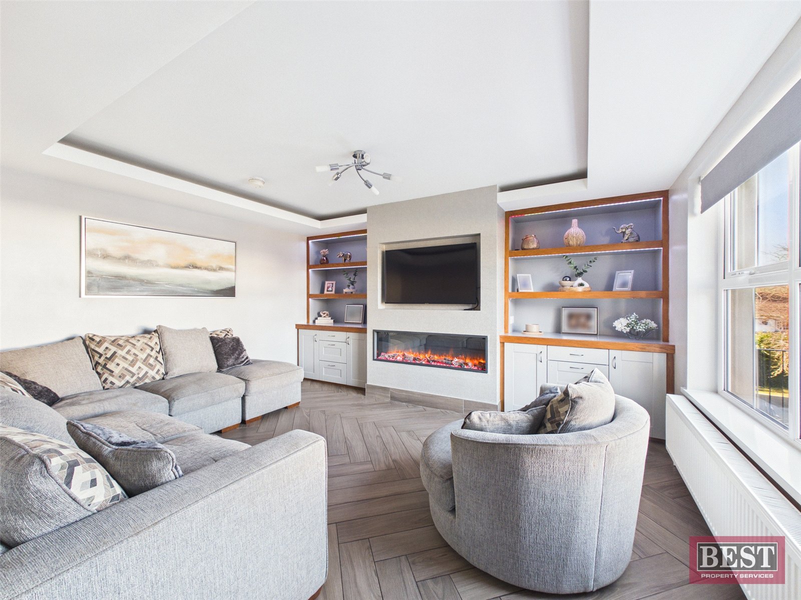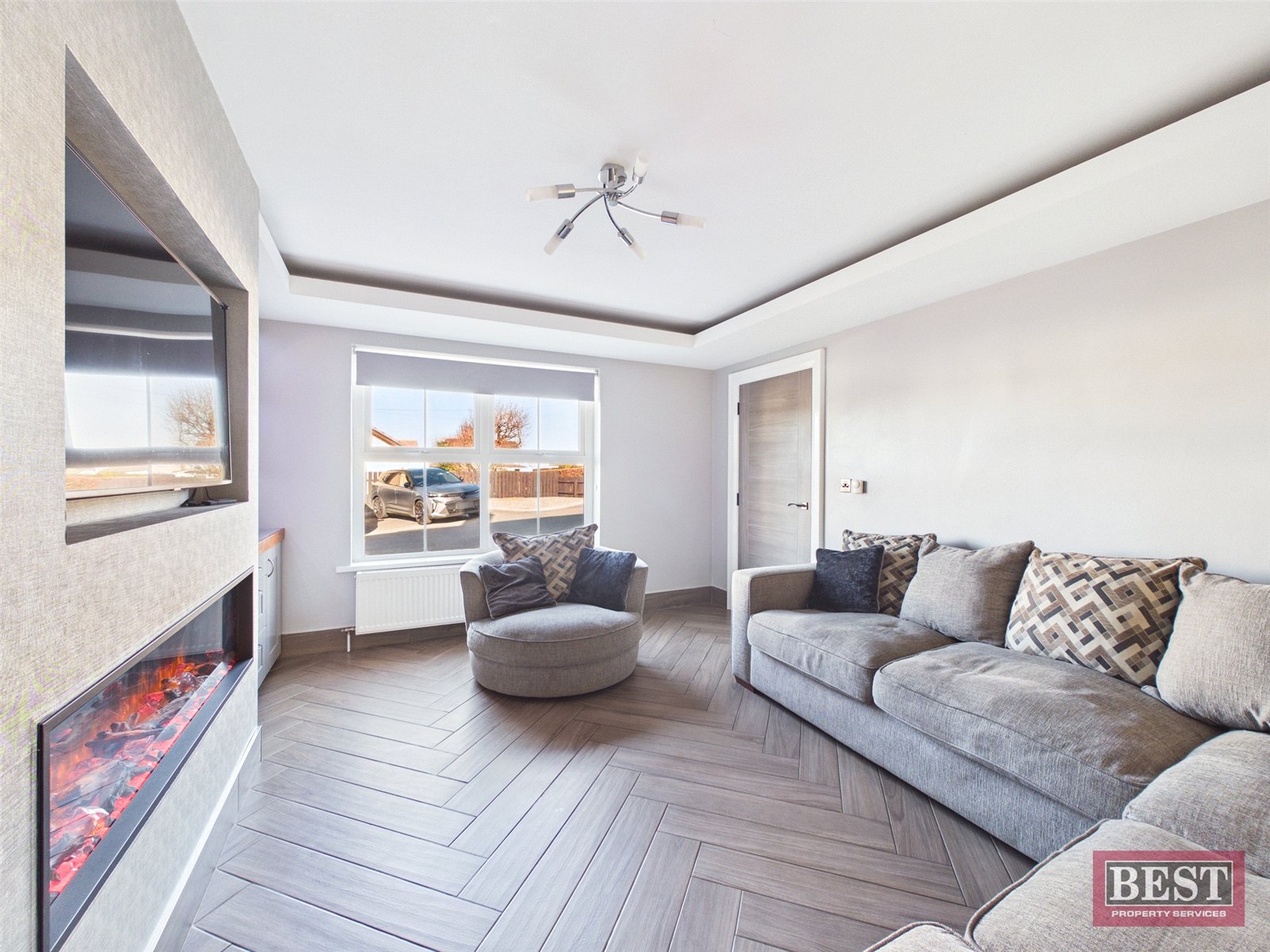 The ground floor comprises a welcoming entrance hall with stylish tile-effect flooring. The spacious living room also features tile-effect flooring and benefits from a contemporary media wall with an inset electric fire, creating a modern and comfortable living space.