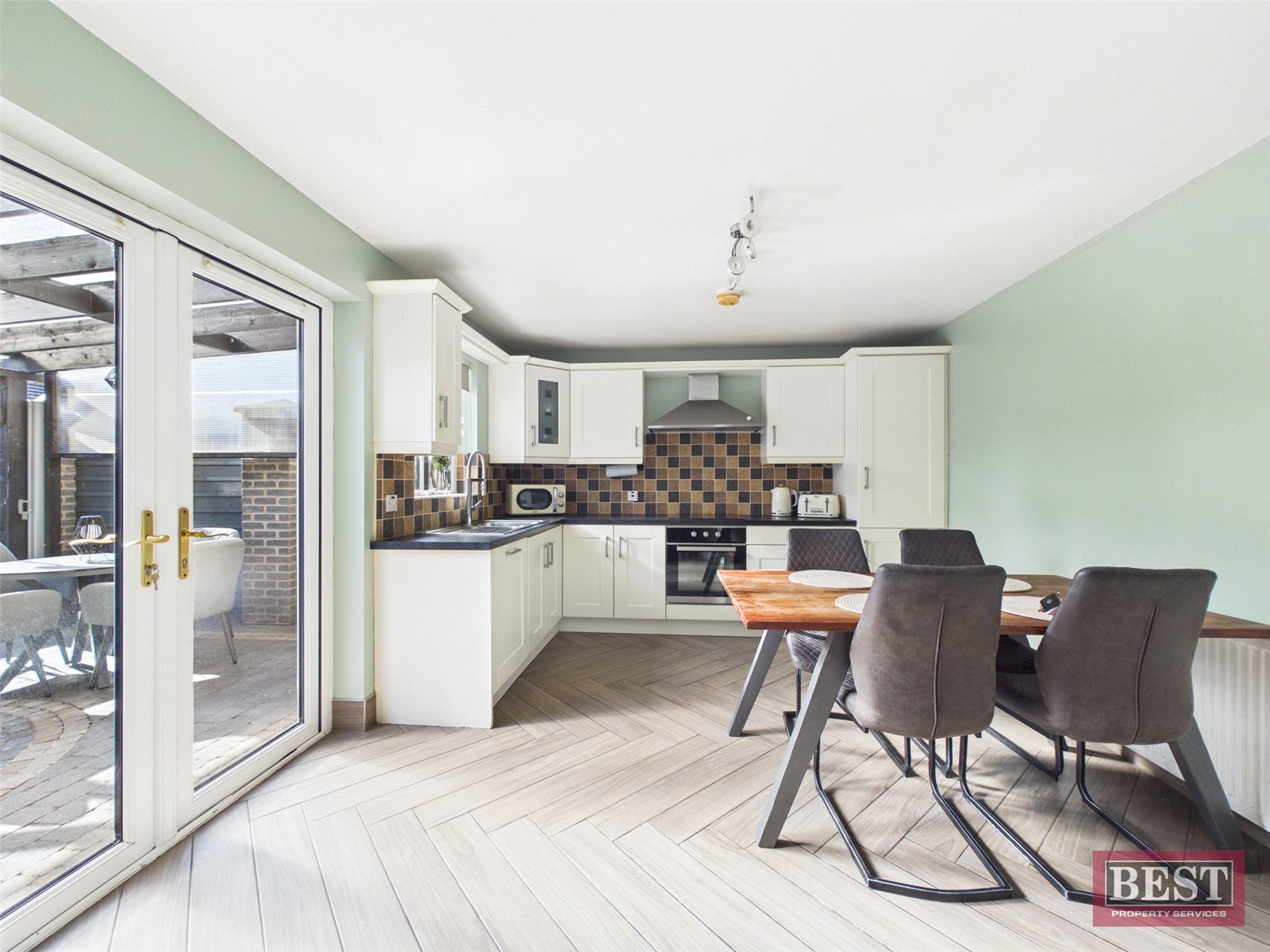 To the rear of the property is a bright and well-appointed kitchen/dining area, fitted with a range of modern upper and lower level units and a host of integrated appliances. Double doors lead to a roofed garden pergola and the enclosed rear garden, providing an excellent space for outdoor dining and entertaining. Adjacent to the kitchen is a practical utility room, plumbed for a washing machine and tumble dryer. A convenient downstairs WC completes the ground floor.