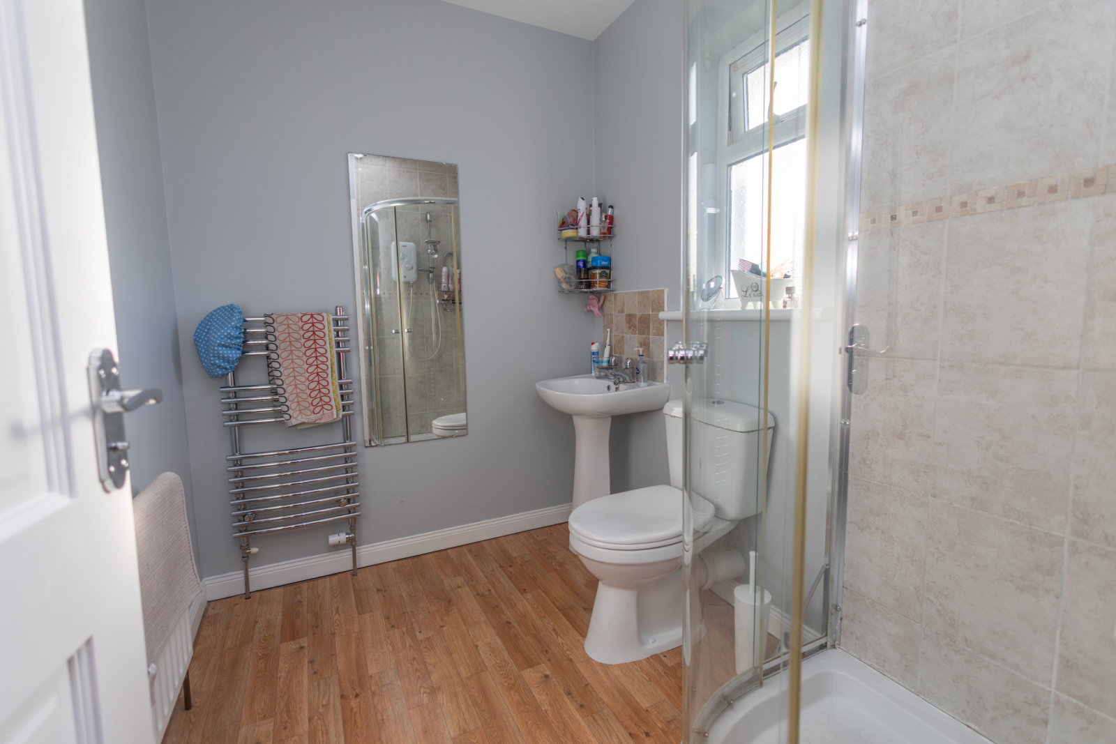 Laminte floor, shower, toilet, sink, recessed down lights, tiled splash back.
