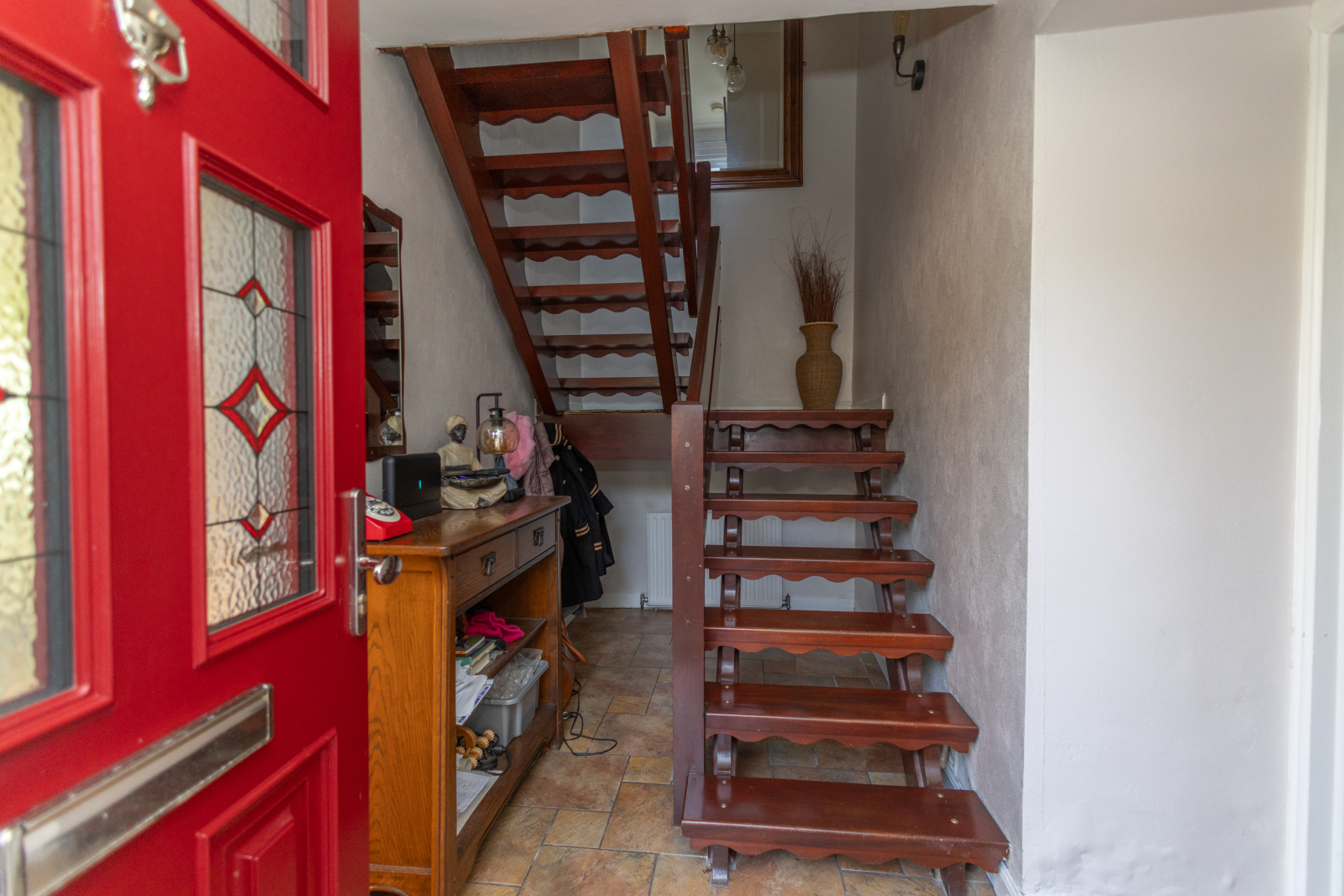 Tiled floor, wooden open riser staircase.