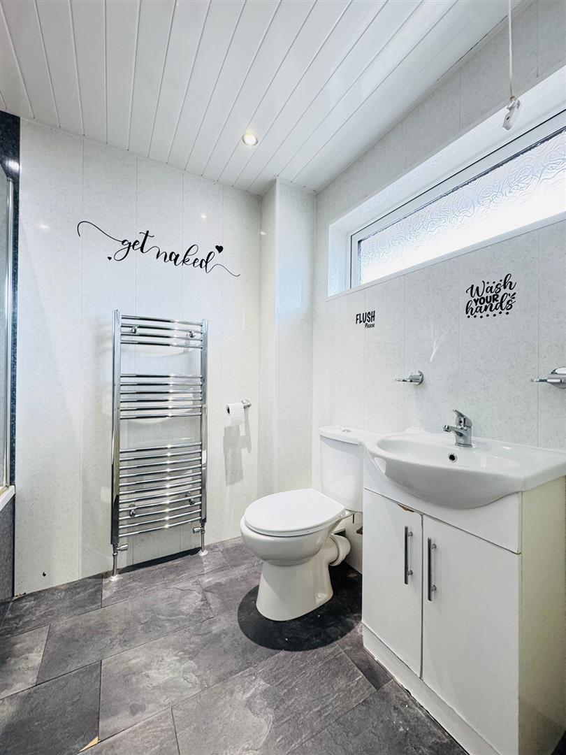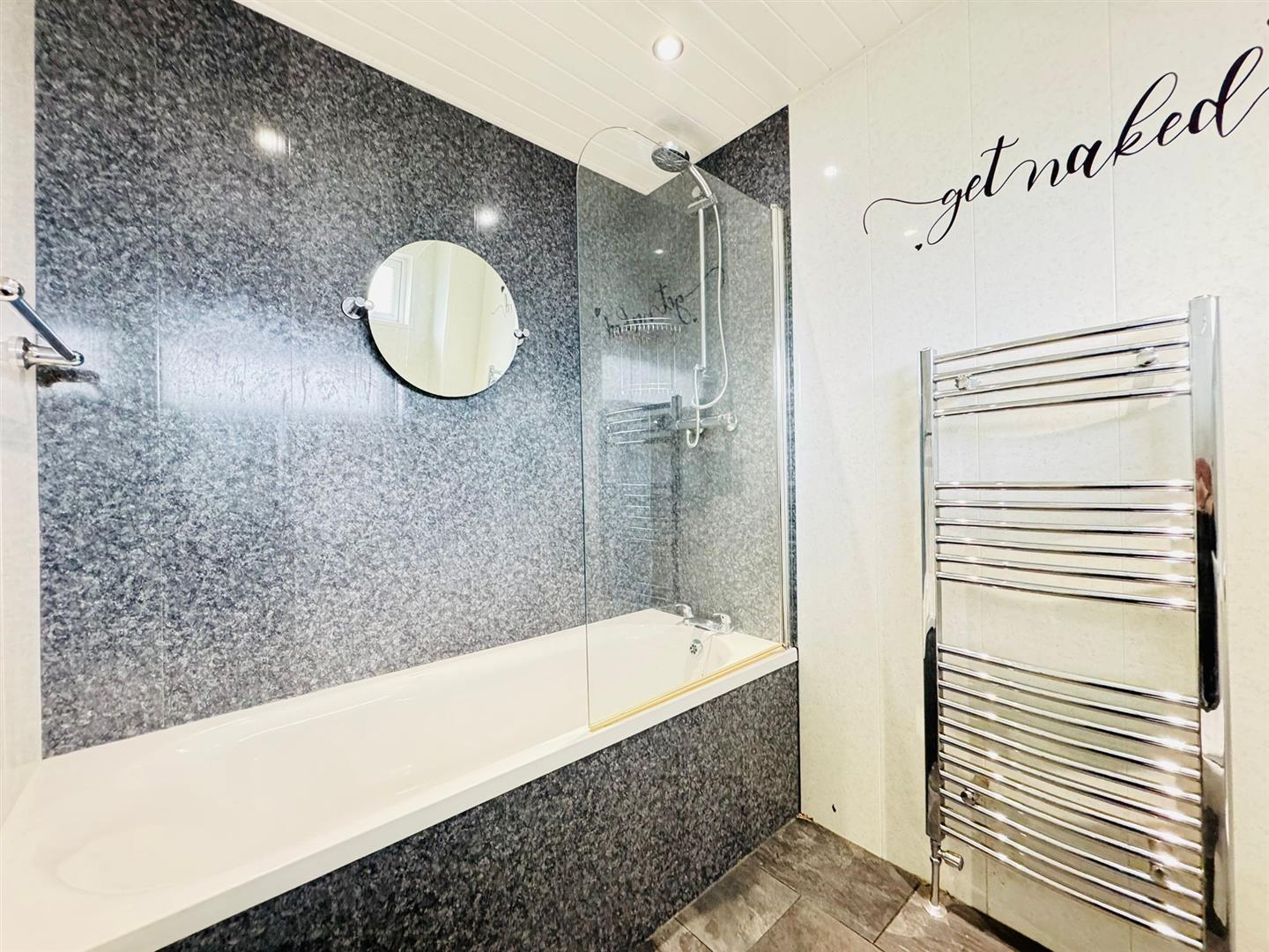 White suite comprising bath, thermostatic shower above, screen, vanity unit, low flsuh wc, fully pvc panelled walls, chrome heated towel radiator