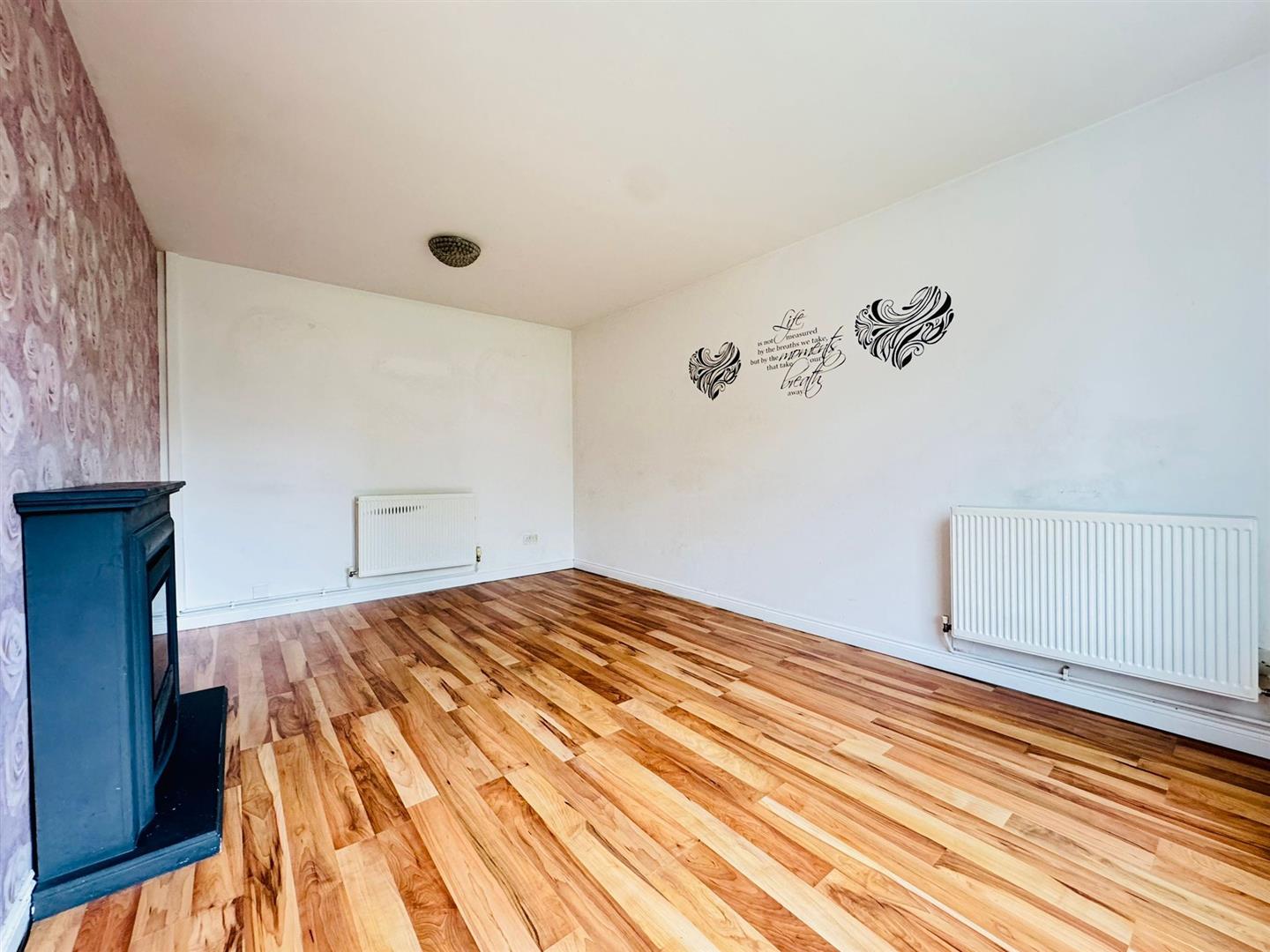 Attractive mock fireplace, wood laminate flooring, radiator