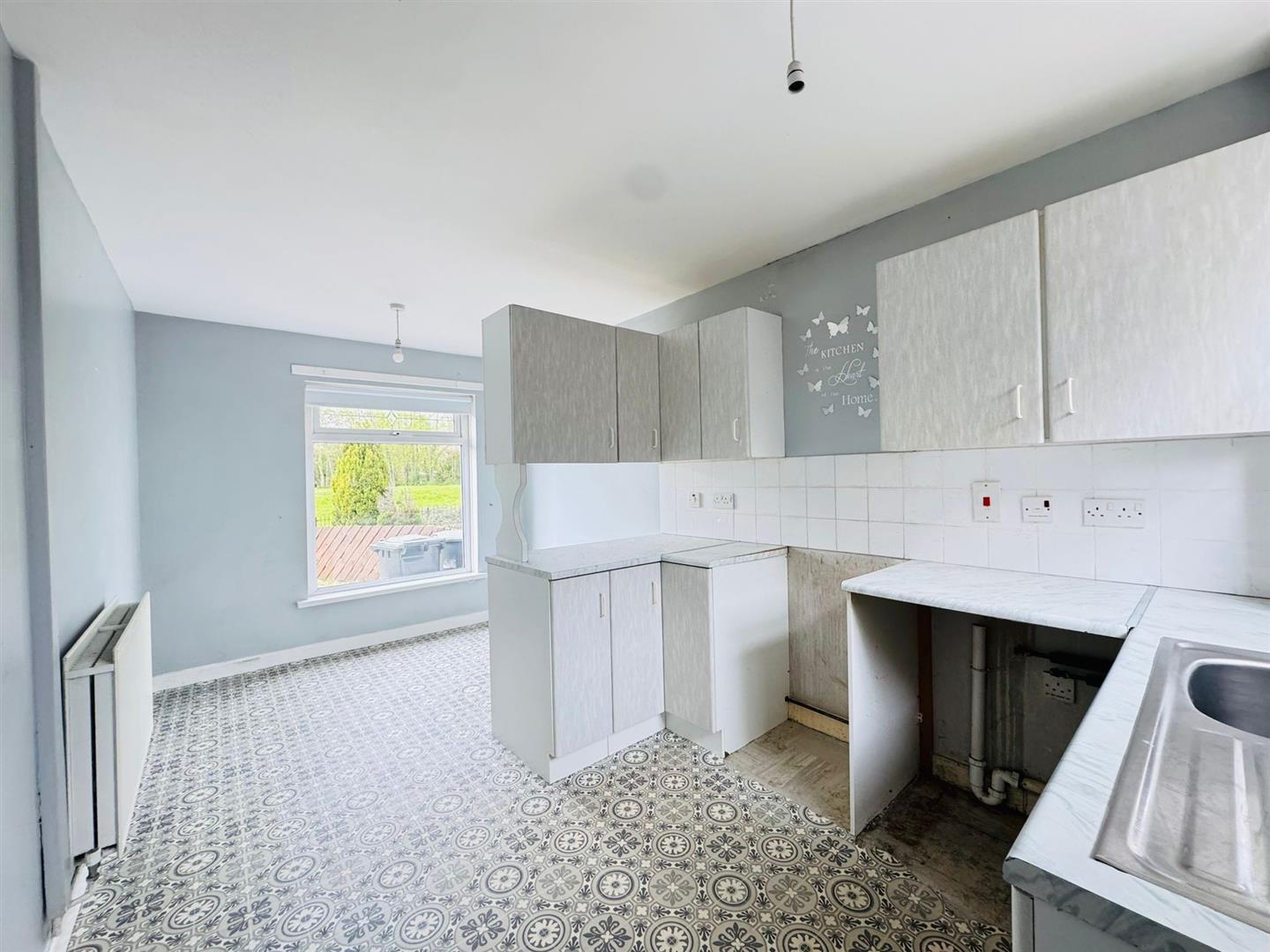 Range of high and low level units, formica worktop, stainless steel single drainer sink unit, cooker space, fridge / freezer space, plumbed for washing machine, partly tiled walls, radiator