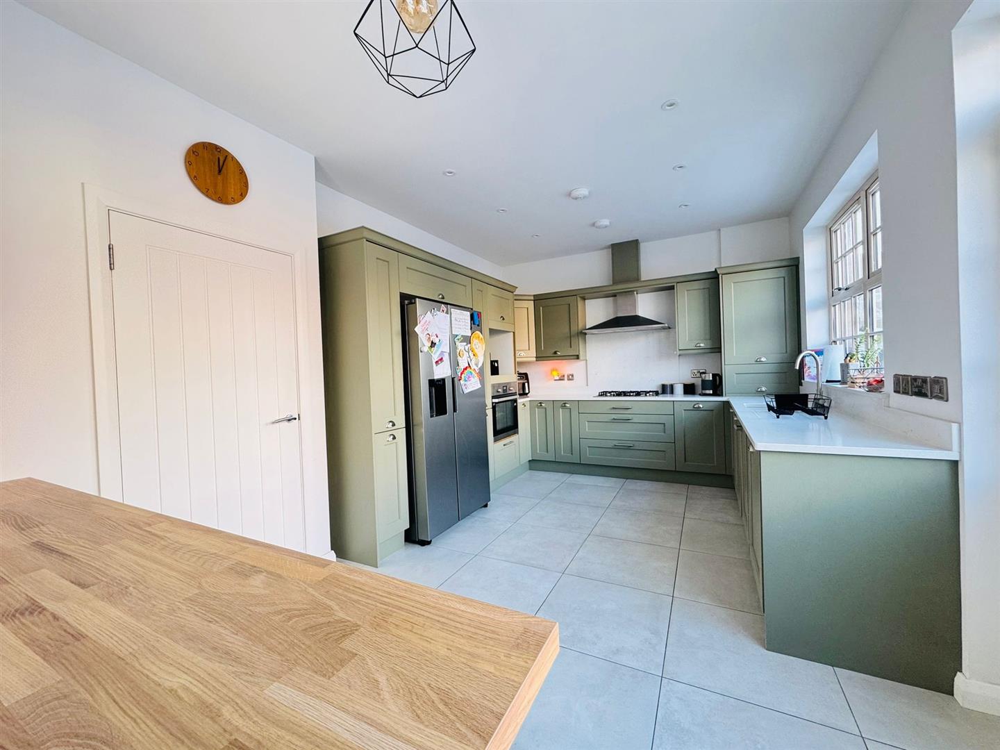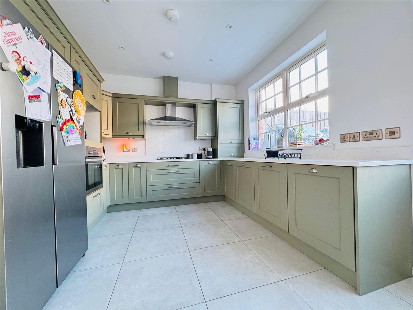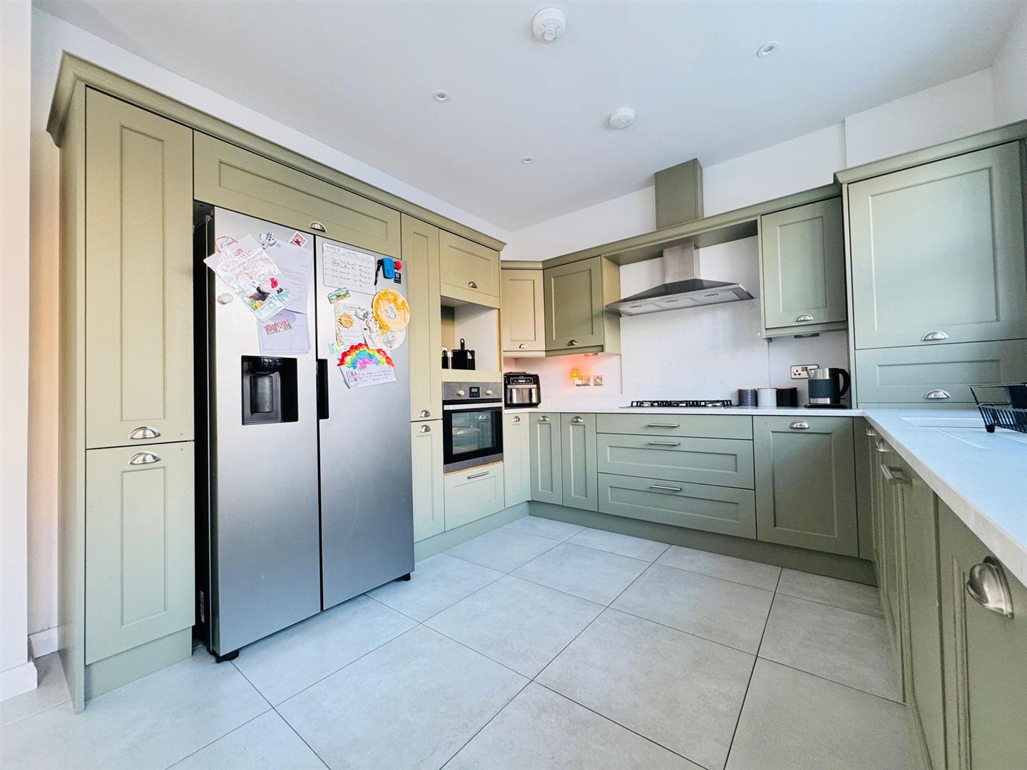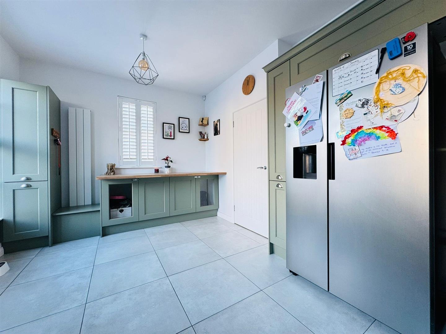 Modern range of high and low level units, quartz worktop, ceramic inlay sink unit, built in oven, gas hob, stainless steel extractor fan, American style fridge / freezer space, integrated dishwasher and washing machine, tiled floor, radiator, pvc double glazed back door