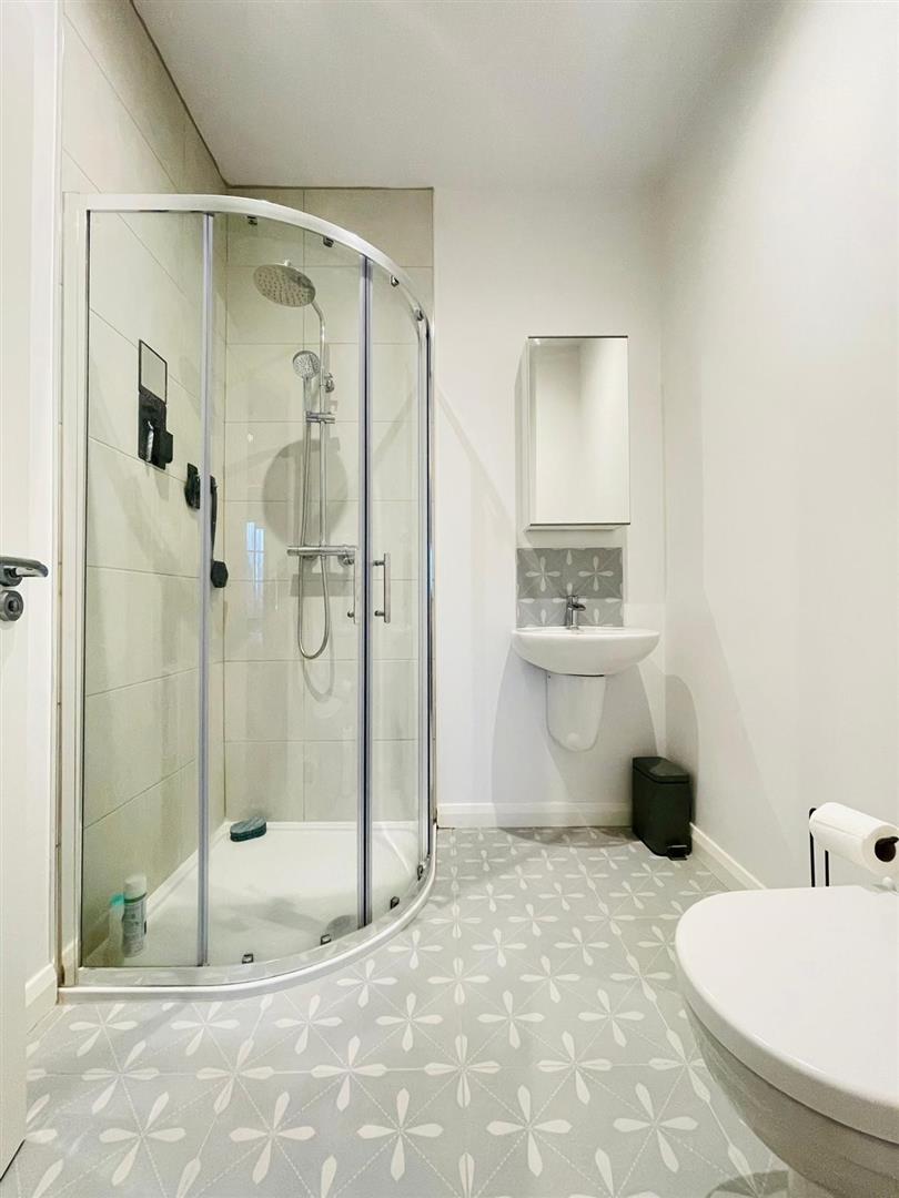 Fully tiled chrome corner shower cubicle, thermostatic shower, semi pedestal wash hand basin, low flush wc, chrome heated towel radiator