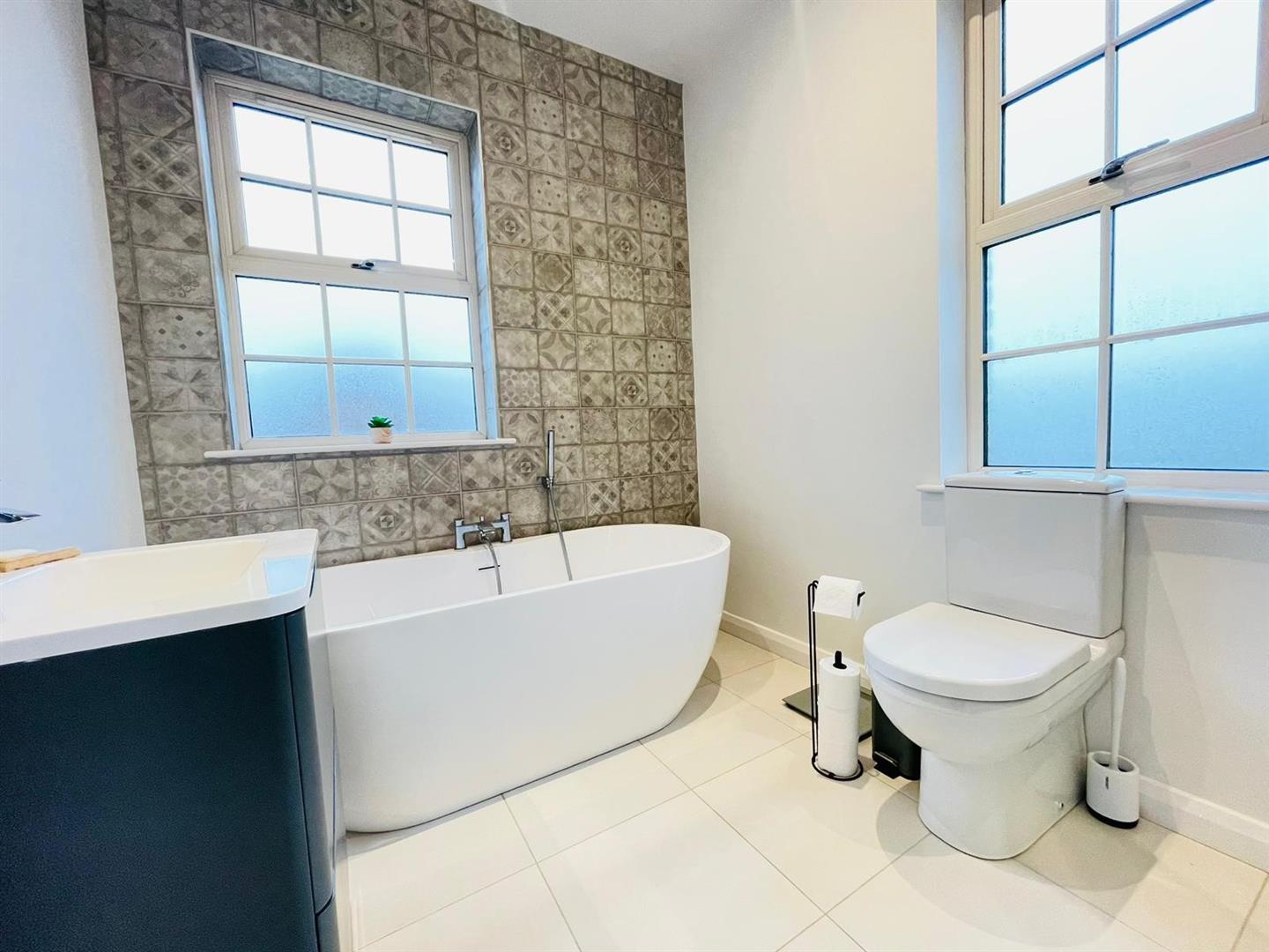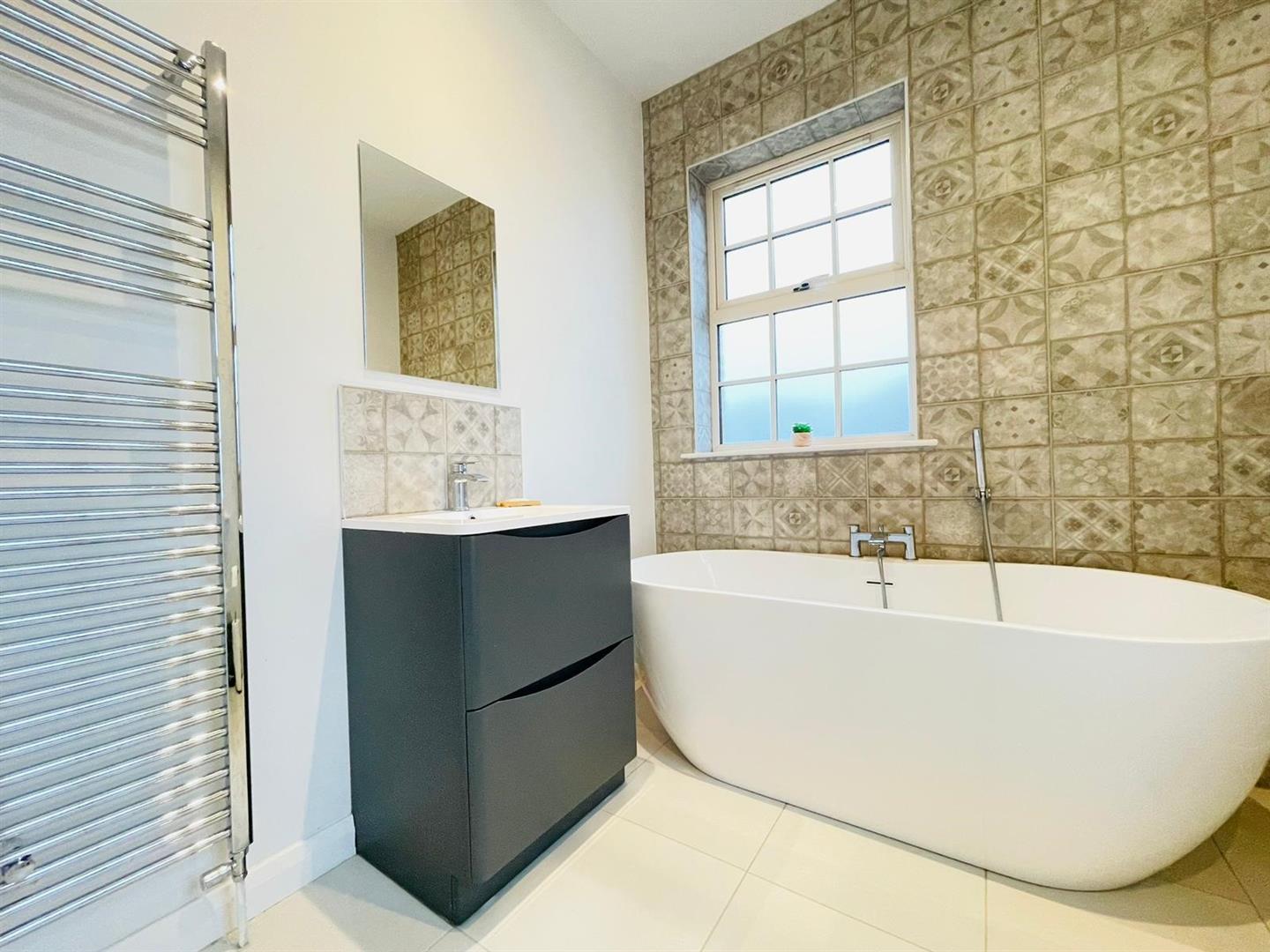 Luxury white suite comprising free standing bath with shower attachment, vanity unit, low flush wc, separate fully tiled shower cubicle, thermostatic shower, tiled floor, chrome heated towel radiator
