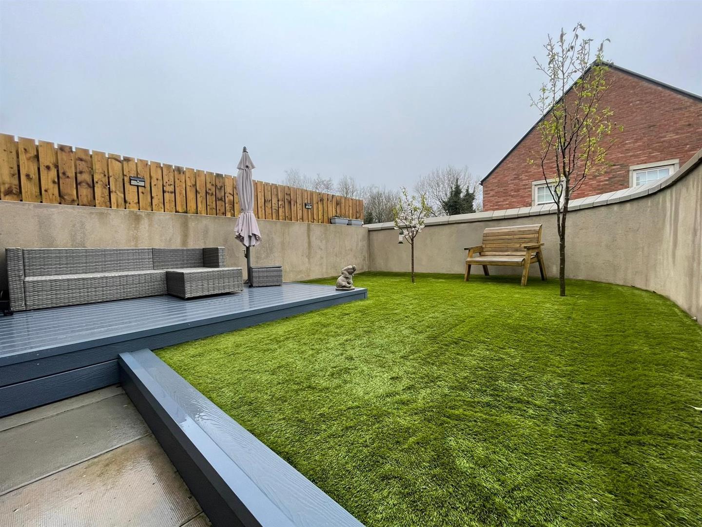Fully enclosed garden to rear in artificial grass with feature composite decking area