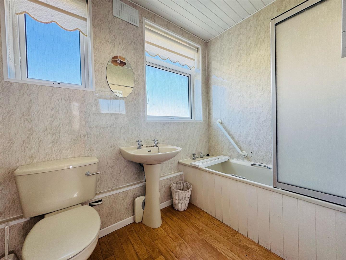 Champagne coloured suite comprising bath, pedestal wash hand basin, low flush wc, fully pvc panelled walls, radiator