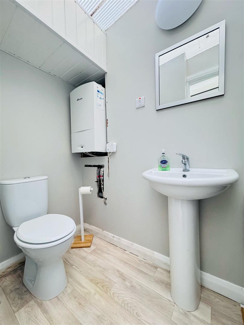 Low flush wc, pedestal wash hand basin, radiator, gas boiler