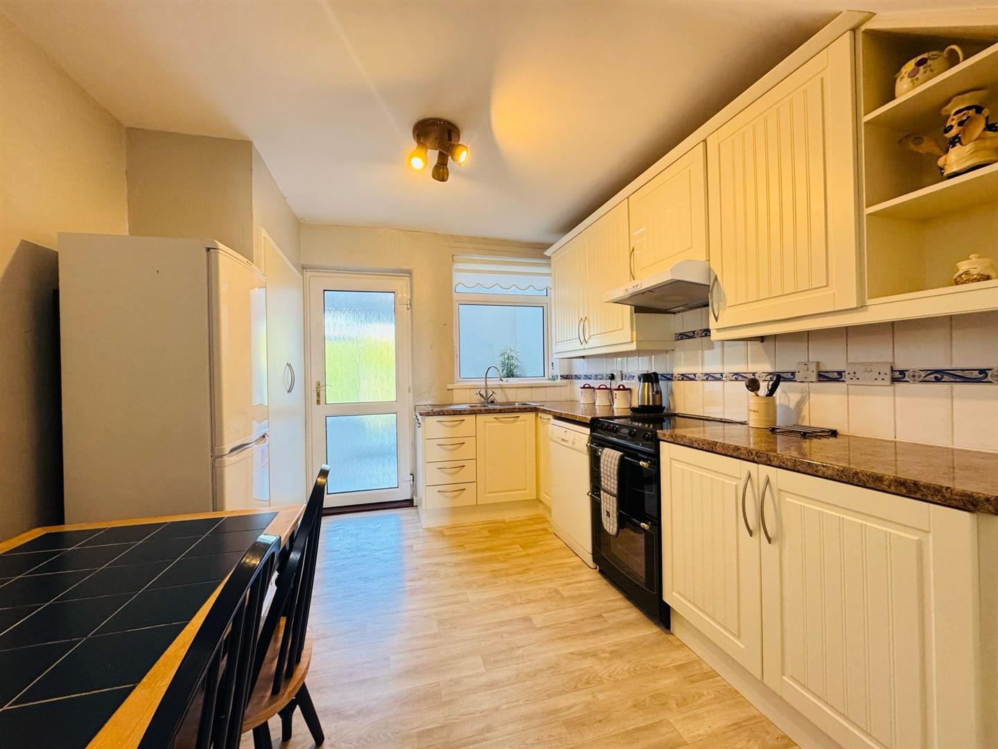 Modern range of high and low level units, formica worktop, basin 1/2 stainless steel sink unit, cooker space, extractor fan, fridge / freezer space, partly tiled walls, radiator, pvc double glazed door to utility / rear porch