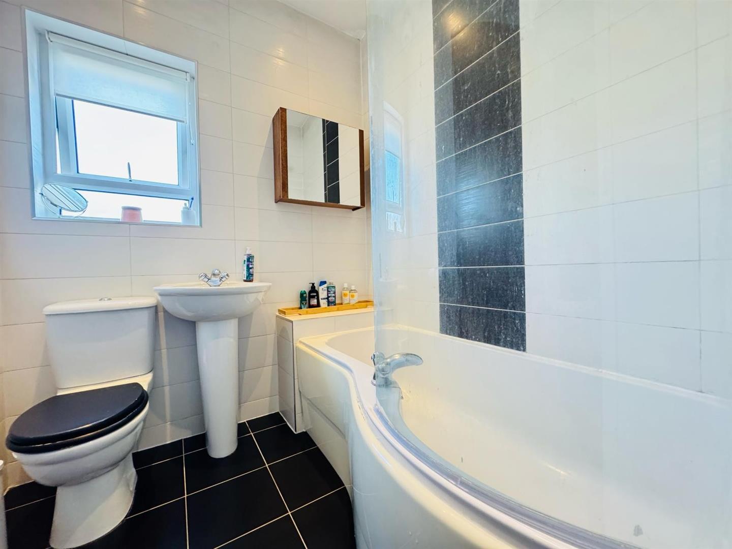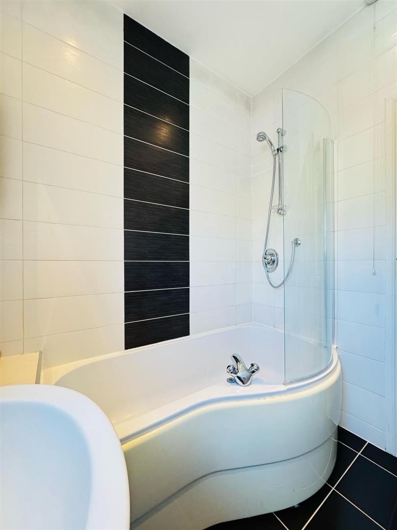 White suite comprising panelled shower bath, shower above, screen, pedestal wash hand basin, low flush wc, fully tiled walls, tiled floor, radiator