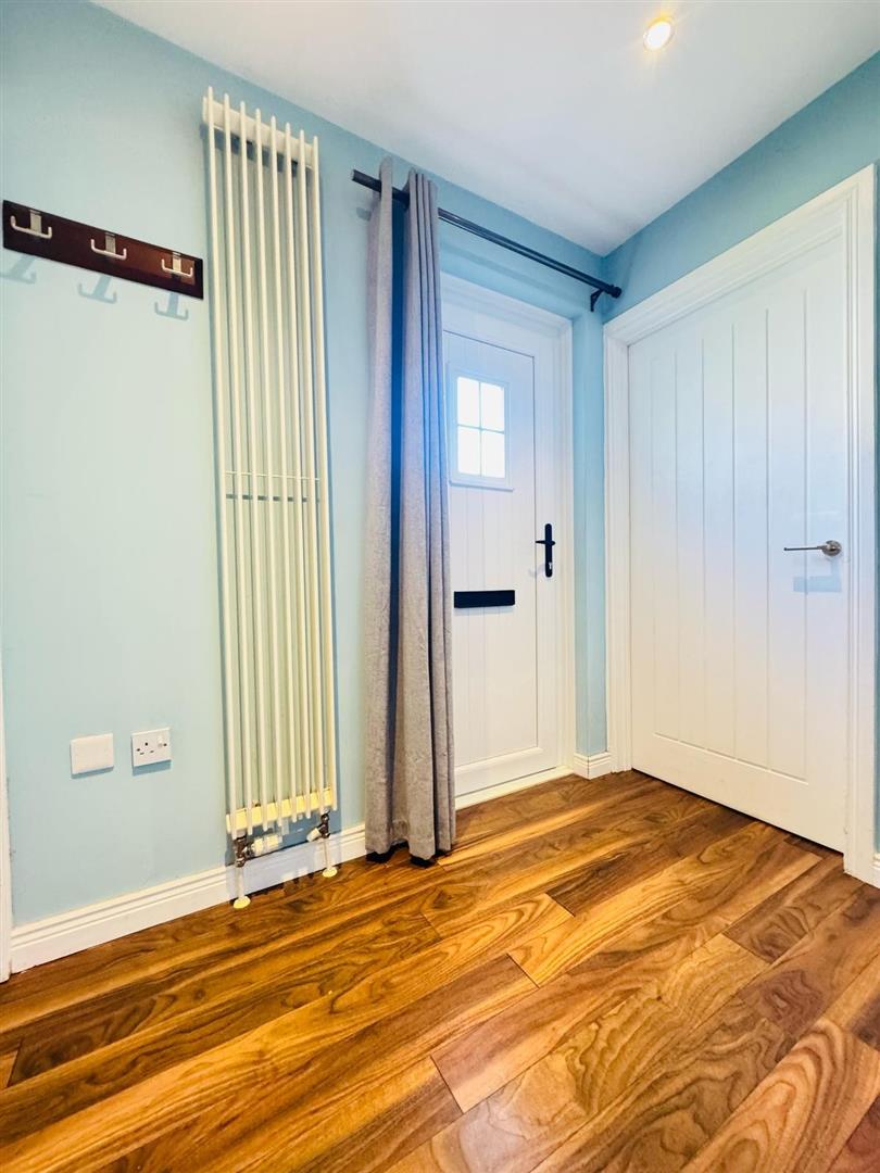 Pvc double glazed front door, wood laminate flooring, modern vertical radiator