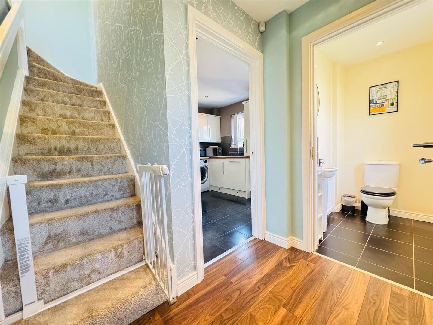 Inside the accommodation comprises; entrance hall with furnished cloakroom, good size lounge with feature chimney breast with inset gas fire and wood laminate flooring and a separate cream high gloss fitted kitchen / diner with integrated appliances and access to rear.