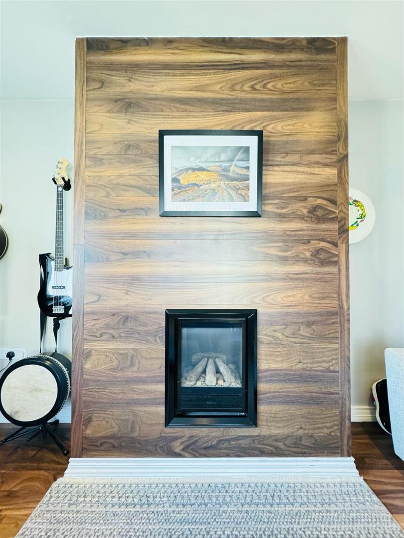 Feature chimney breast with inset gas fire, wood laminate flooring, two radiators