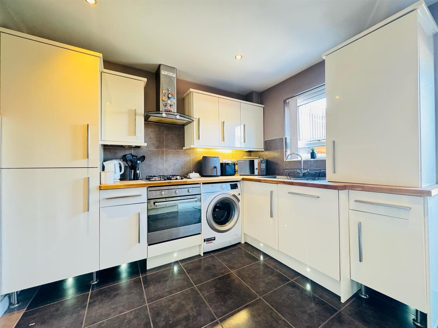 Modern range of cream high gloss high and low level units, wood effect worktop, stainless steel single drainer sink unit, built in stainless steel oven, stainless steel gas hob, stainless steel extractor fan, integrated fridge / freezer and dishwasher, plumbed for washing machine, gas boiler, partly tiled walls, tiled floor, radiator, pvc double glazed back door