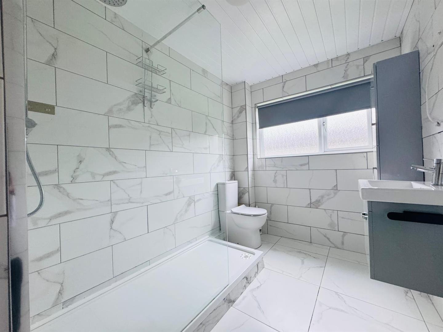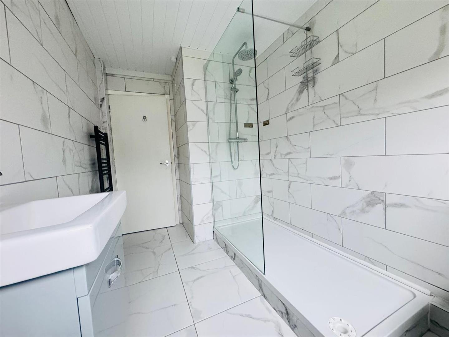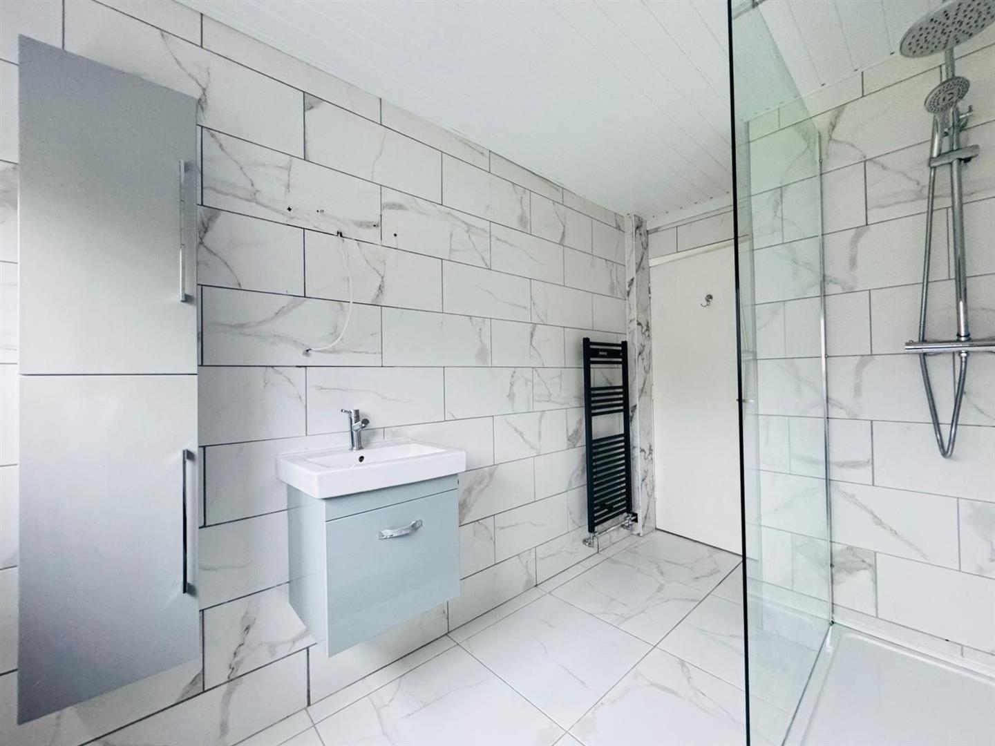 Walk in shower area, thermostatic shower, floating vanity unit, low flush wc, tiled walls, tiled floor, heated towel radiator