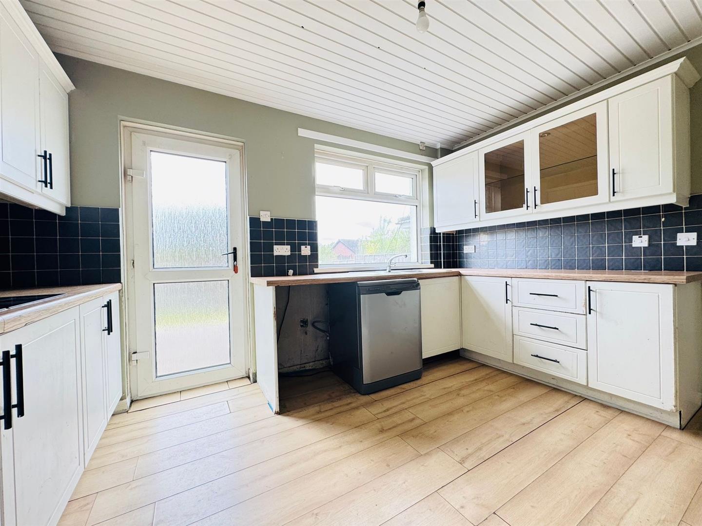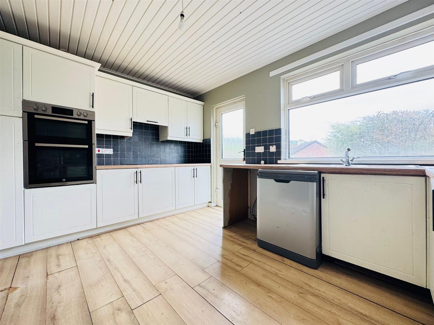 Range of high and low level units, formica worktop, basin 1/2 stainless steel sink unit, built in stainless double oven, ceramic hob. extractor fan, fridge / freezer space, plumbed for washing machine and dishwasher, partly tiled walls, wood laminate flooring, radiator, pvc double glazed back door