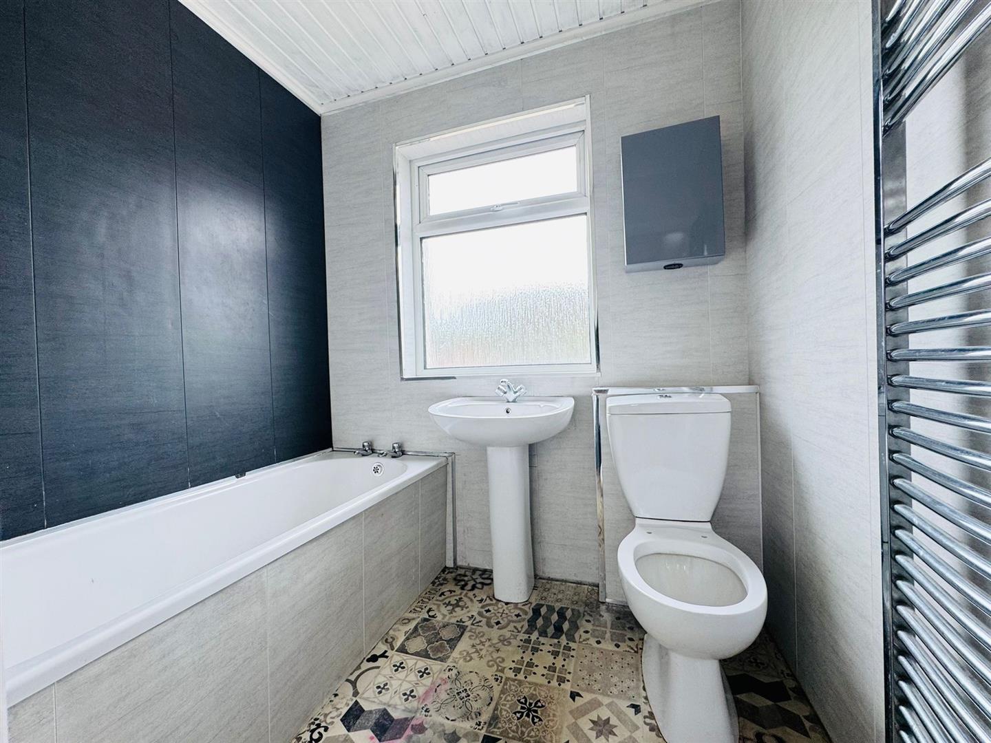 White suite comprising bath, plumbed for shower, pedestal wash hand basin, low flush wc, fully pvc panelled walls, chrome heated towel radiator