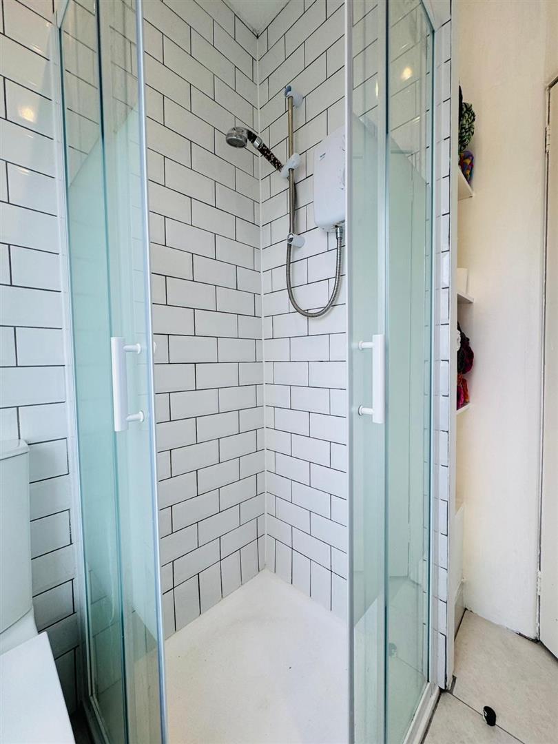 Fully tiled shower cubicle, Triton electric shower, vanity unit, low flush wc, tiled floor, chrome heated towel radiator