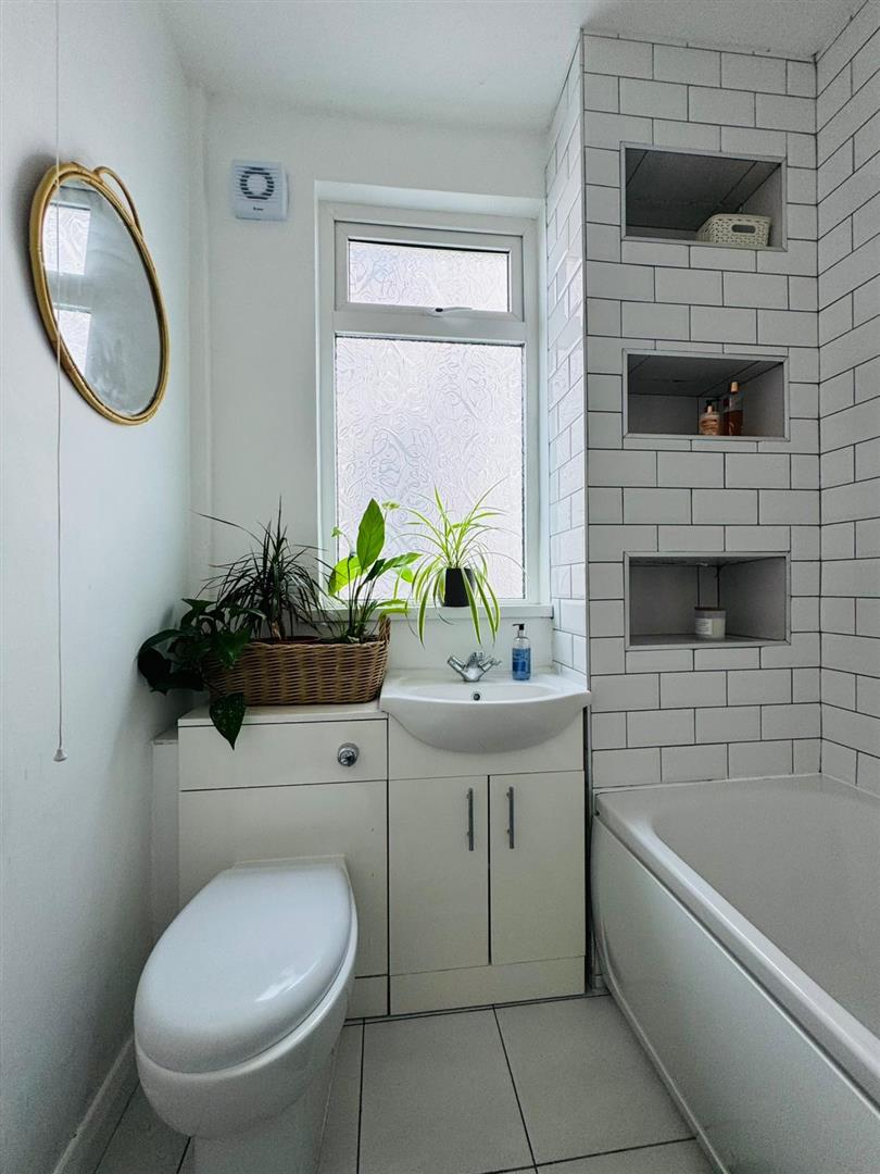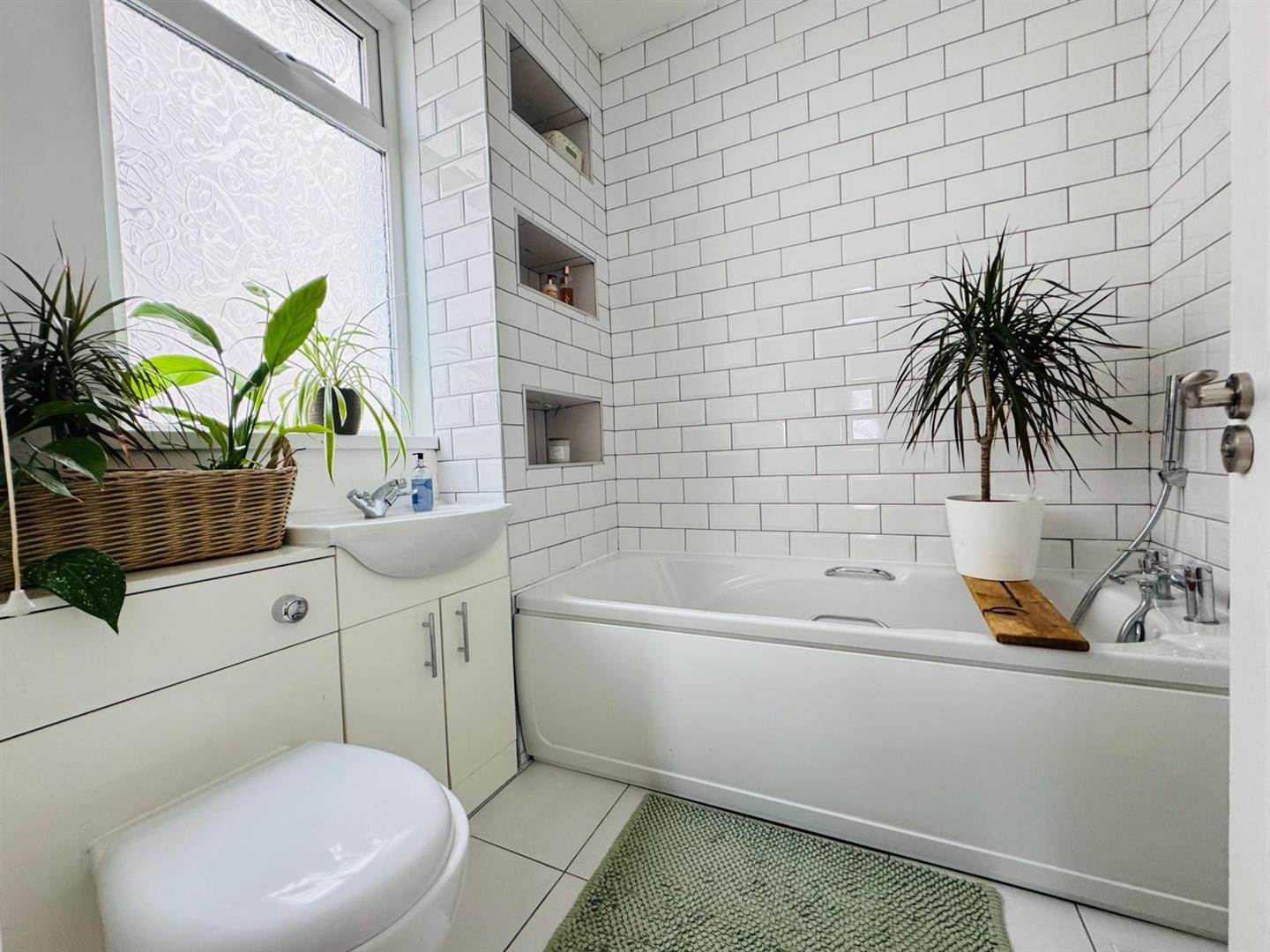 Modern white suite comprising panelled bath. shower attachment, vanity unit, enclosed cistern wc, partly tiled walls, tiled floor, radiator