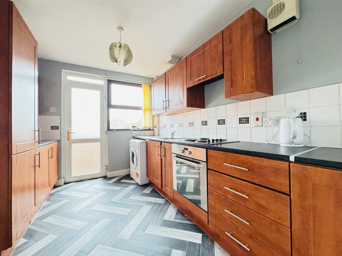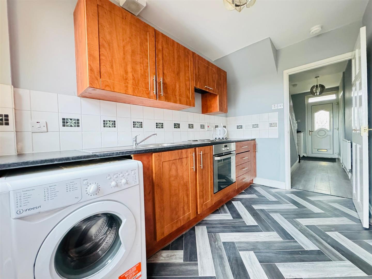 Range of high and low level units, formica worktop, stainless steel single drainer sink unit, built in stainless steel oven, stainless steel hob, integrated fridge / freezer, plumbed for washing machine, partly tiled walls, double glazed back door.