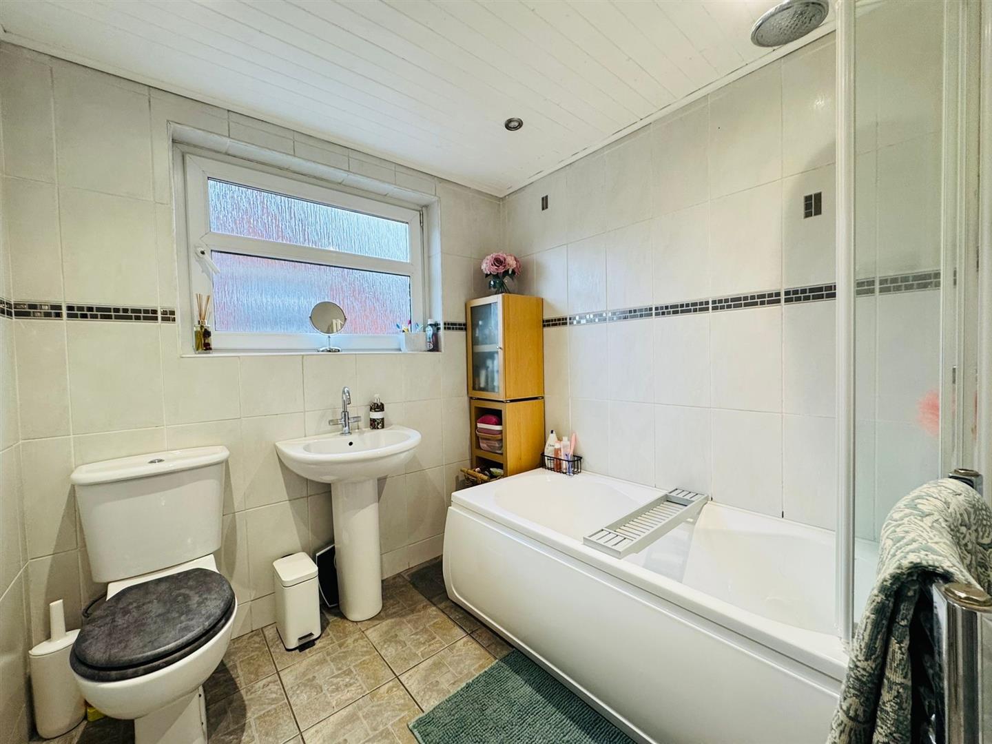 White suite comprising: panelled bath with Thermostatic shower and screen. pedestal wash hand basin and low flush W.C. Fully tiled walls, tiled floor, chrome heated towel rail.
