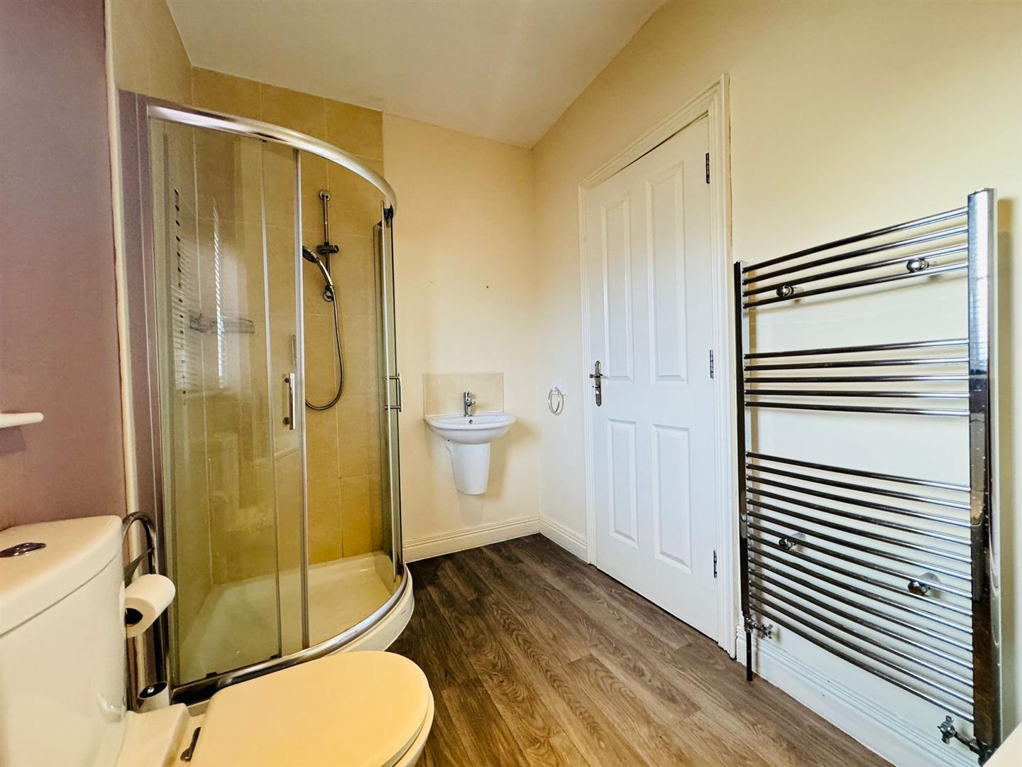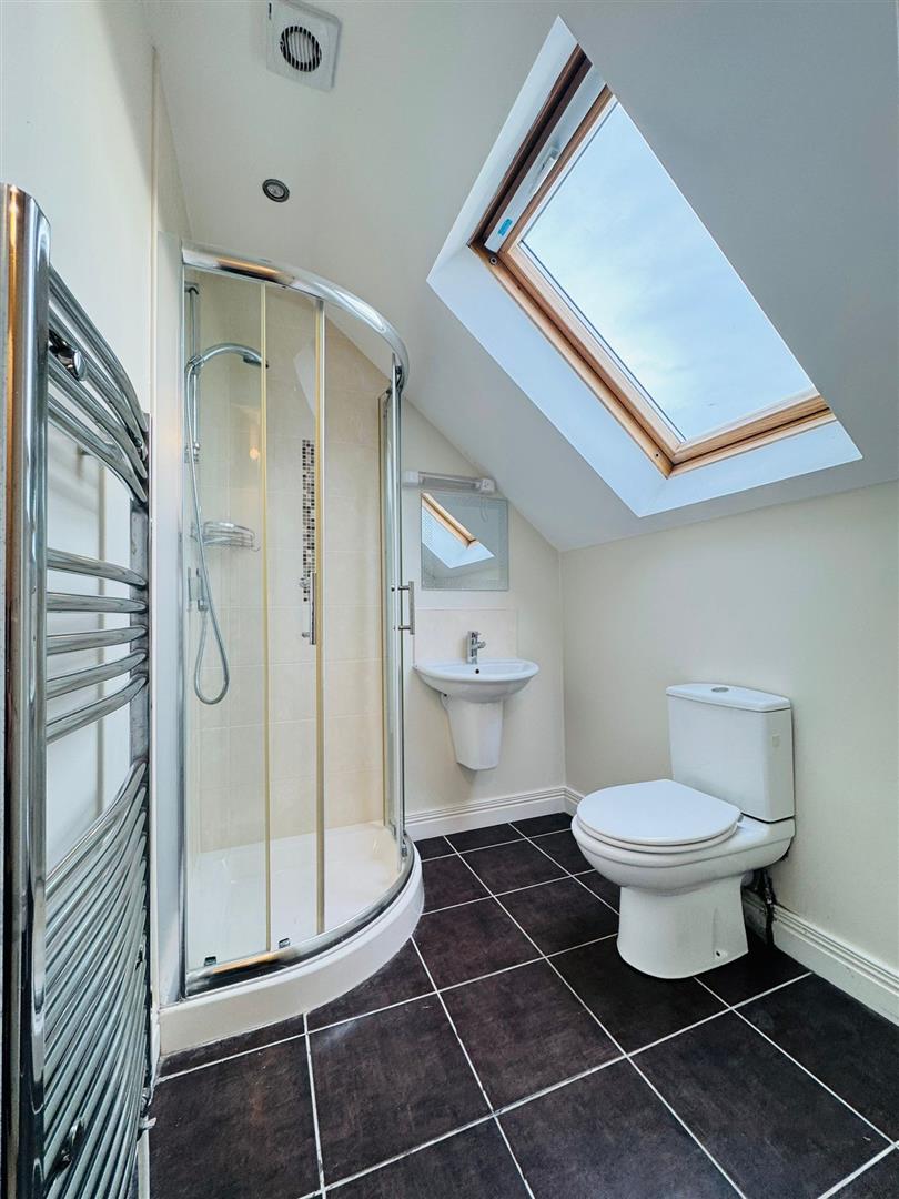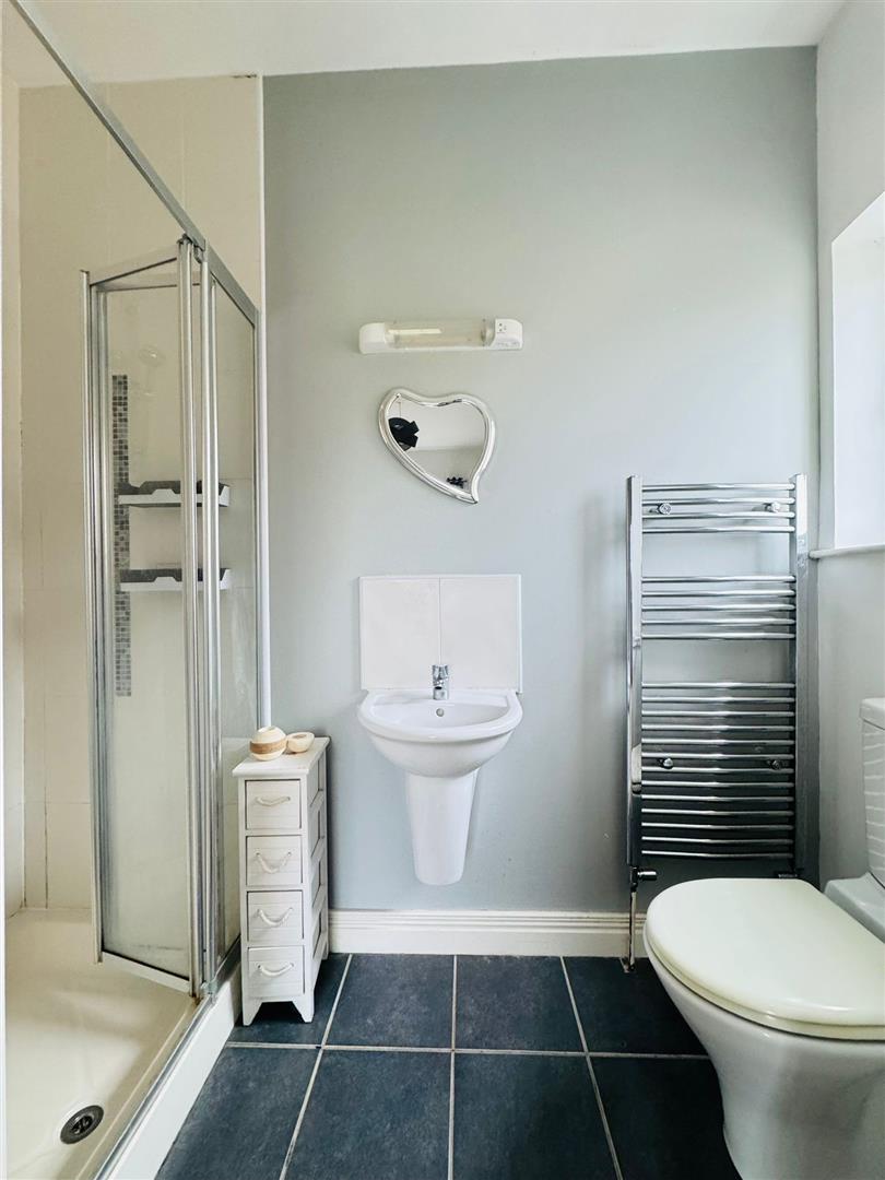 Fully tiled shower cubicle, semi pedestal wash hand basin, low flush wc, tiled floor, chrome heated towel radiator