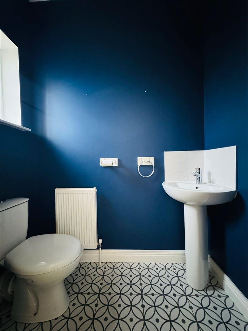 Low flush wc, corner pedestal wash hand basin, tiled floor, radiator