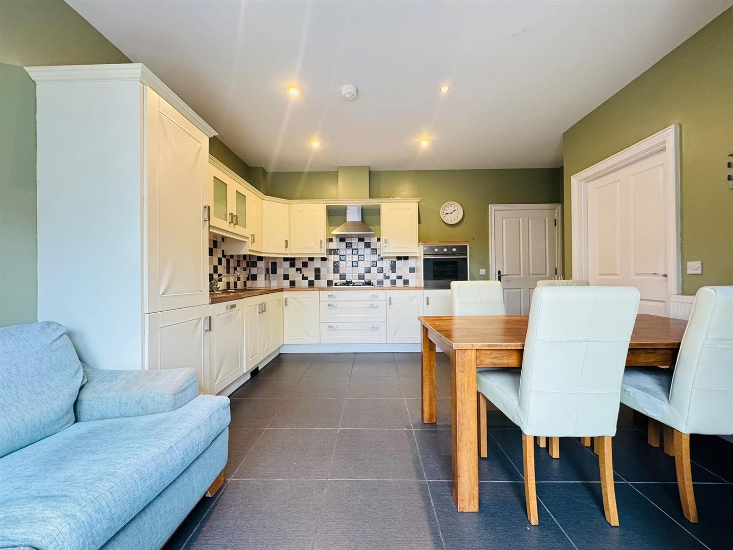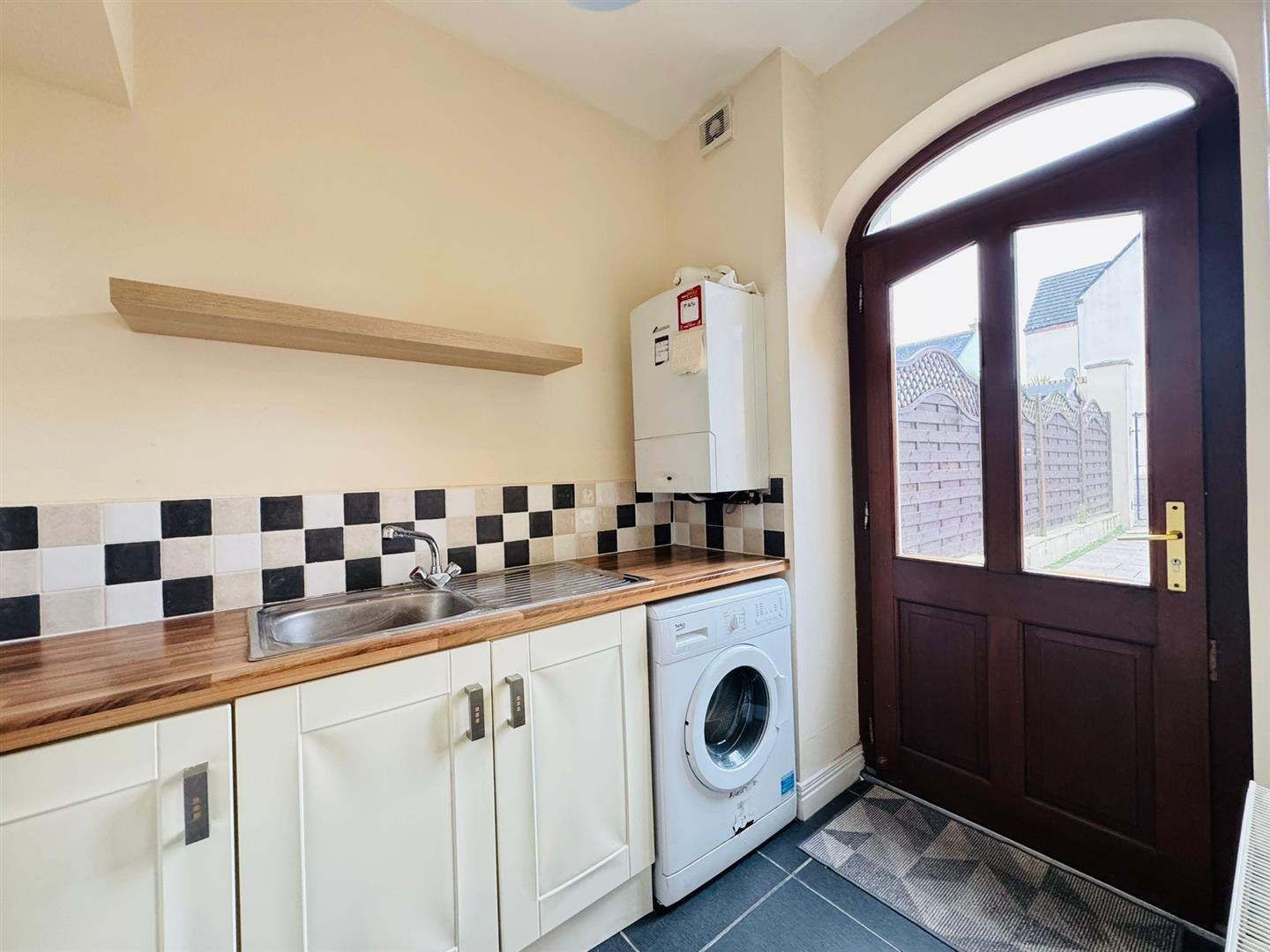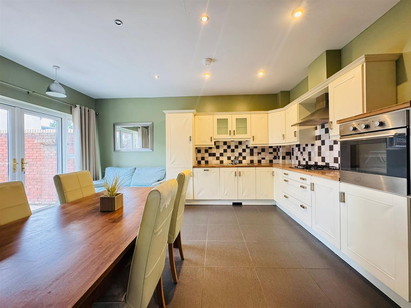 Range of high and low level units, formica worktop, basin 1/2 stainless steel sink unit, built in stainless steel oven, stainless steel gas hob, stainless steel extractor fan, integrated fridge / freezer & dishwasher, partly tiled walls, tiled floor, radiator, double glazed back door