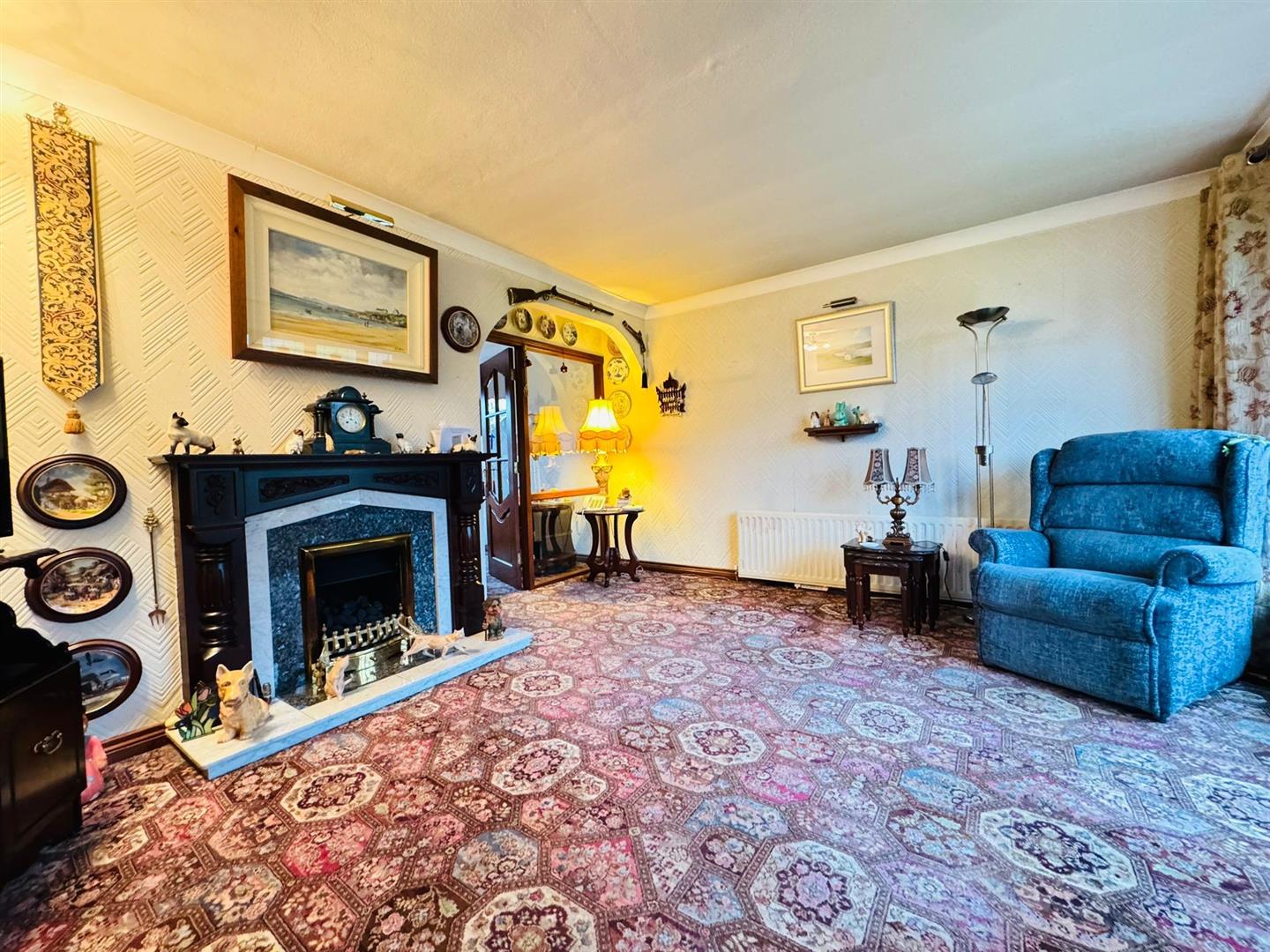 Attractive fireplace, marble & granite inset, mahogany surround, piped for gas fire, radiator
