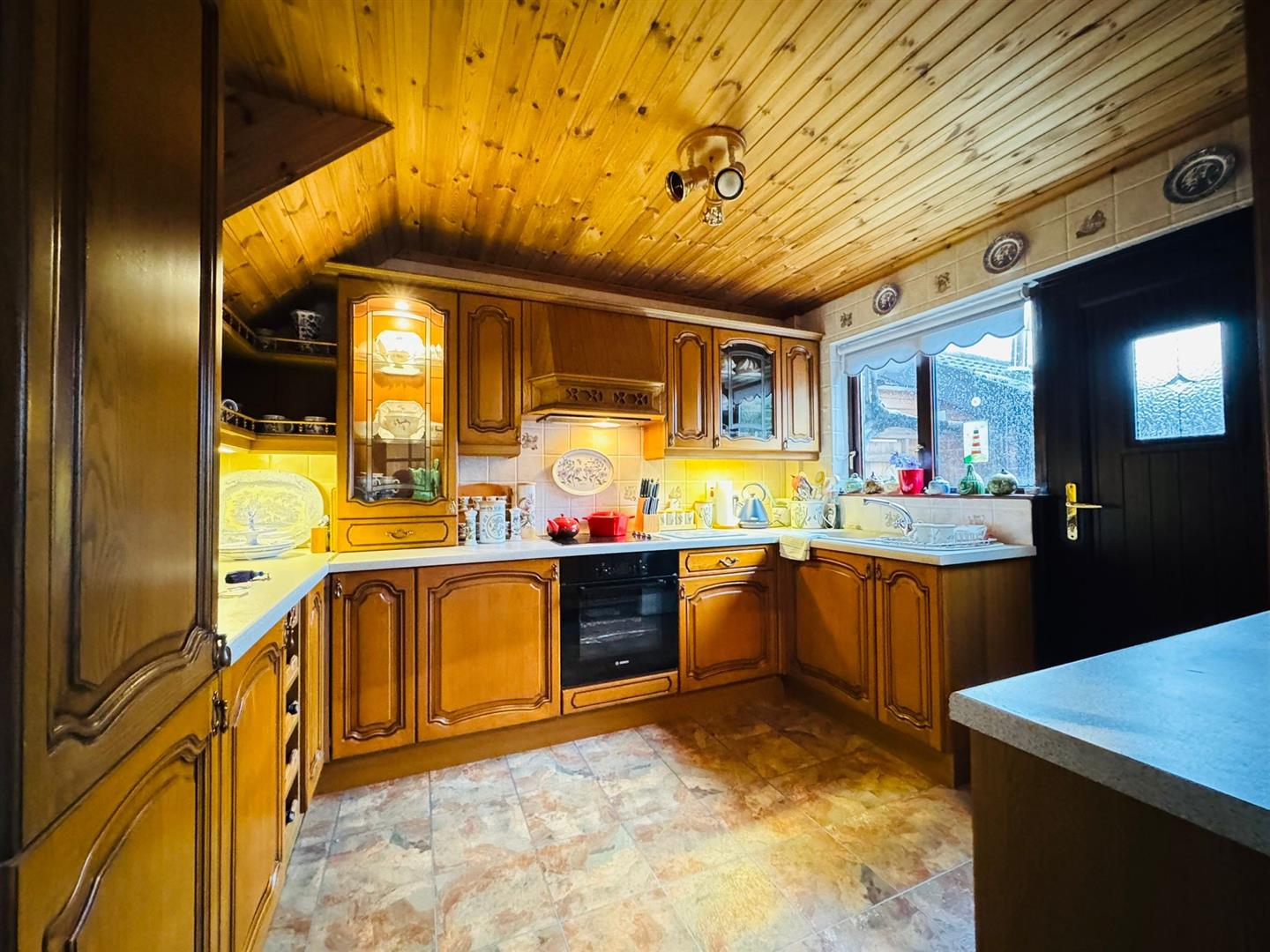 Range of high and low level units, glass display cabinet, formica worktop, basin and a half sink unit, built in oven, ceramic hob, extractor fan, integrated fridge, plumbed for washing machine, partly tiled walls, pvc double glazed back door