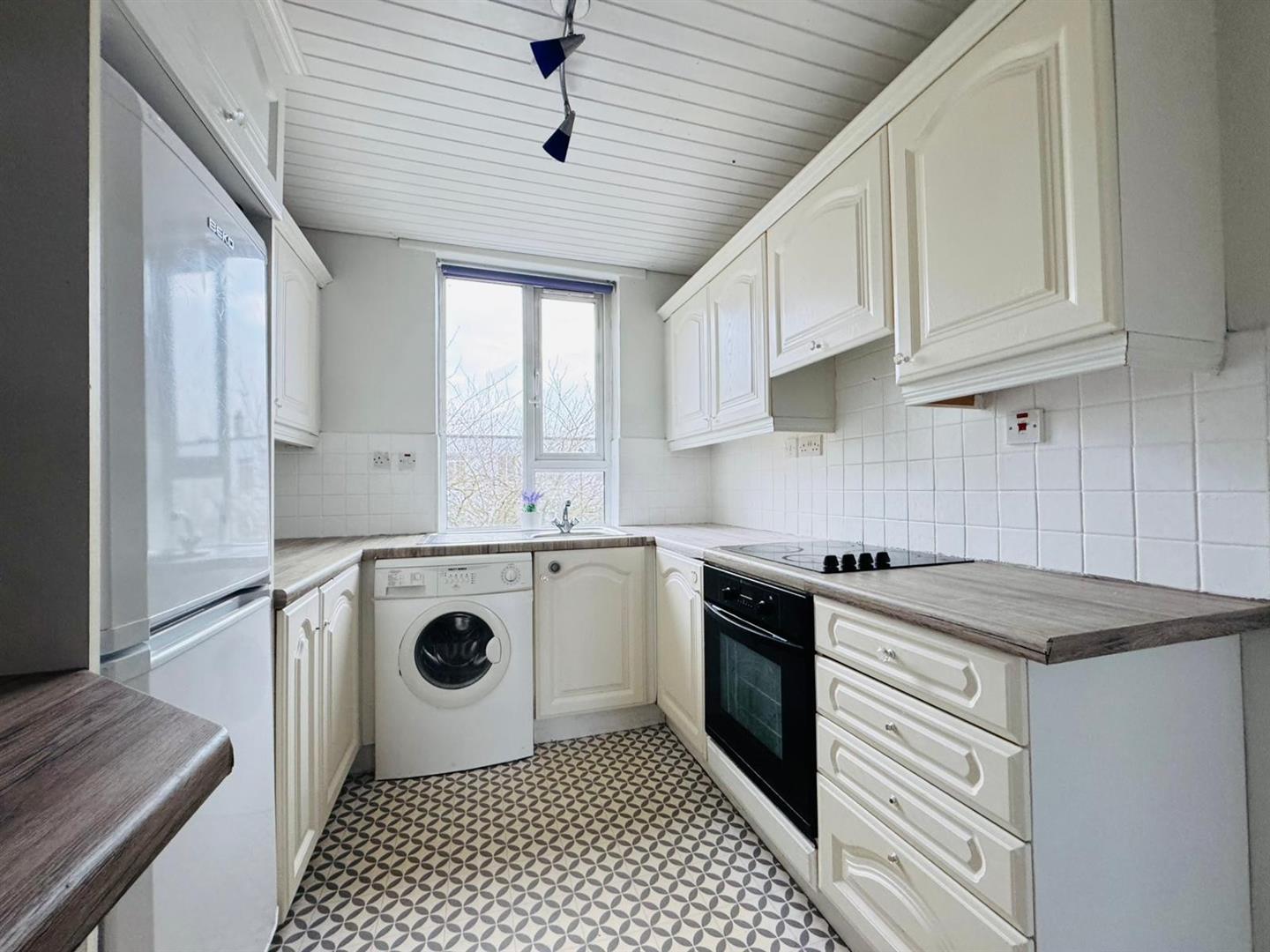 Range of high and low level fitted units, formica worktop, built in under oven, ceramic hob, extractor fan, plumbed for washing machine, fridge / freezer space, breakfast bar. partly tiled walls