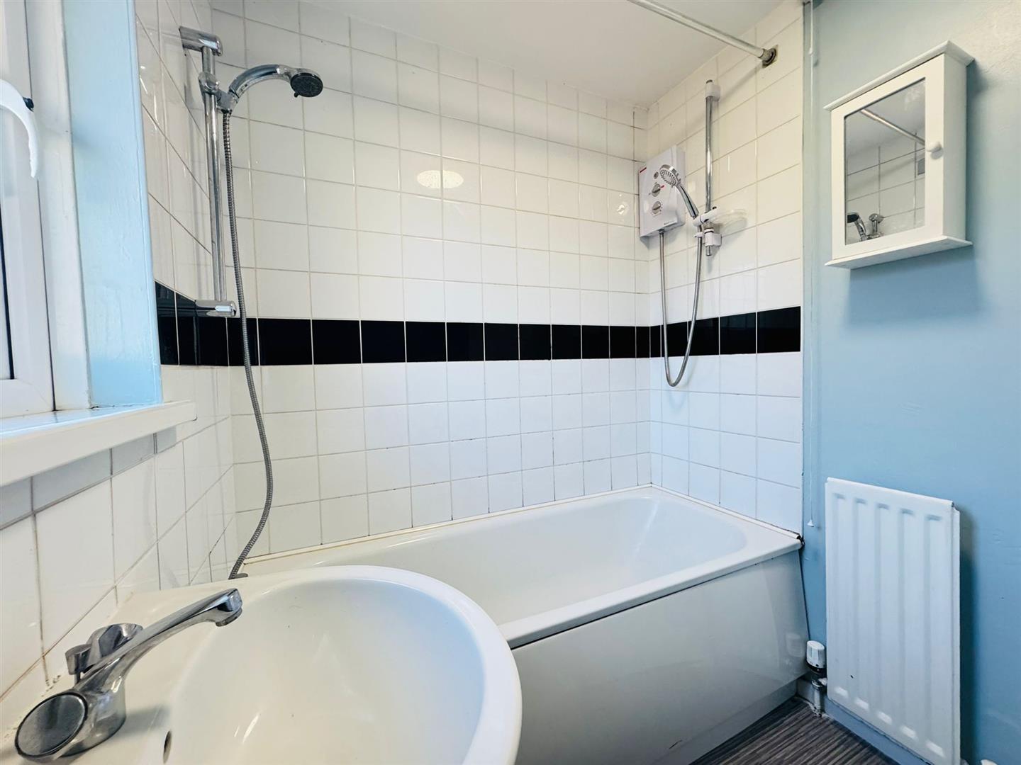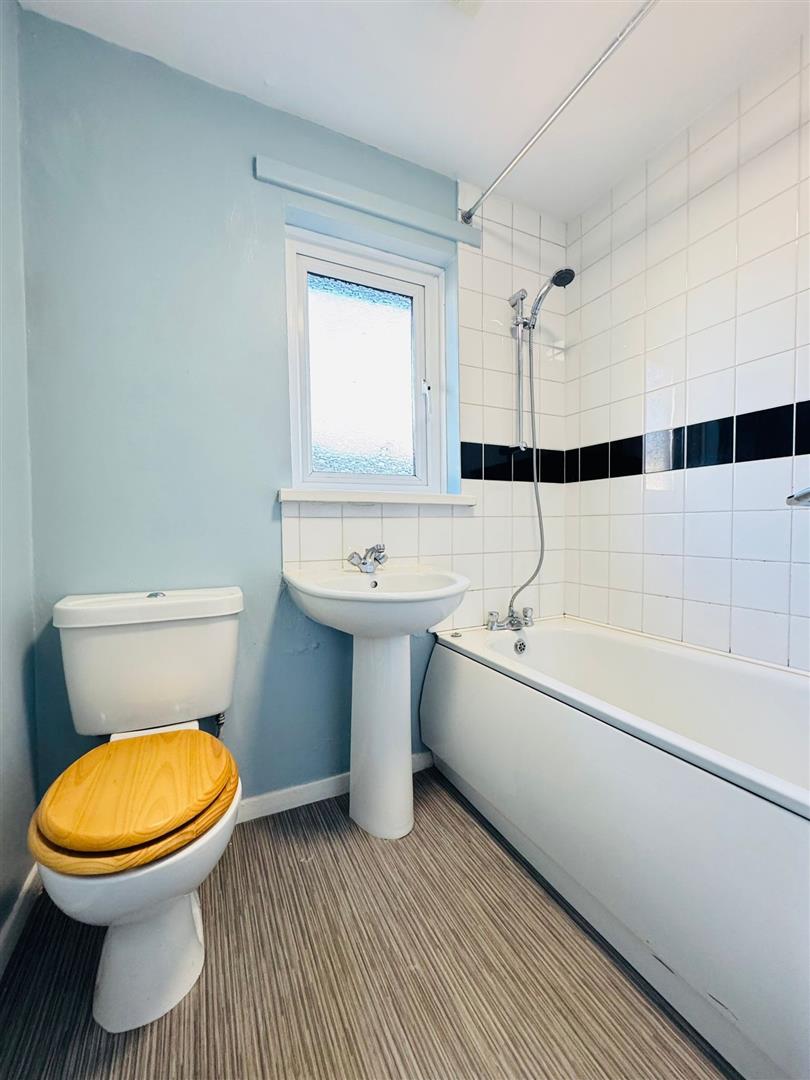White suite comprising panelled bath, shower attachment, pedestal wash hand basin, low flush wc, partly tiled walls, radiator.
