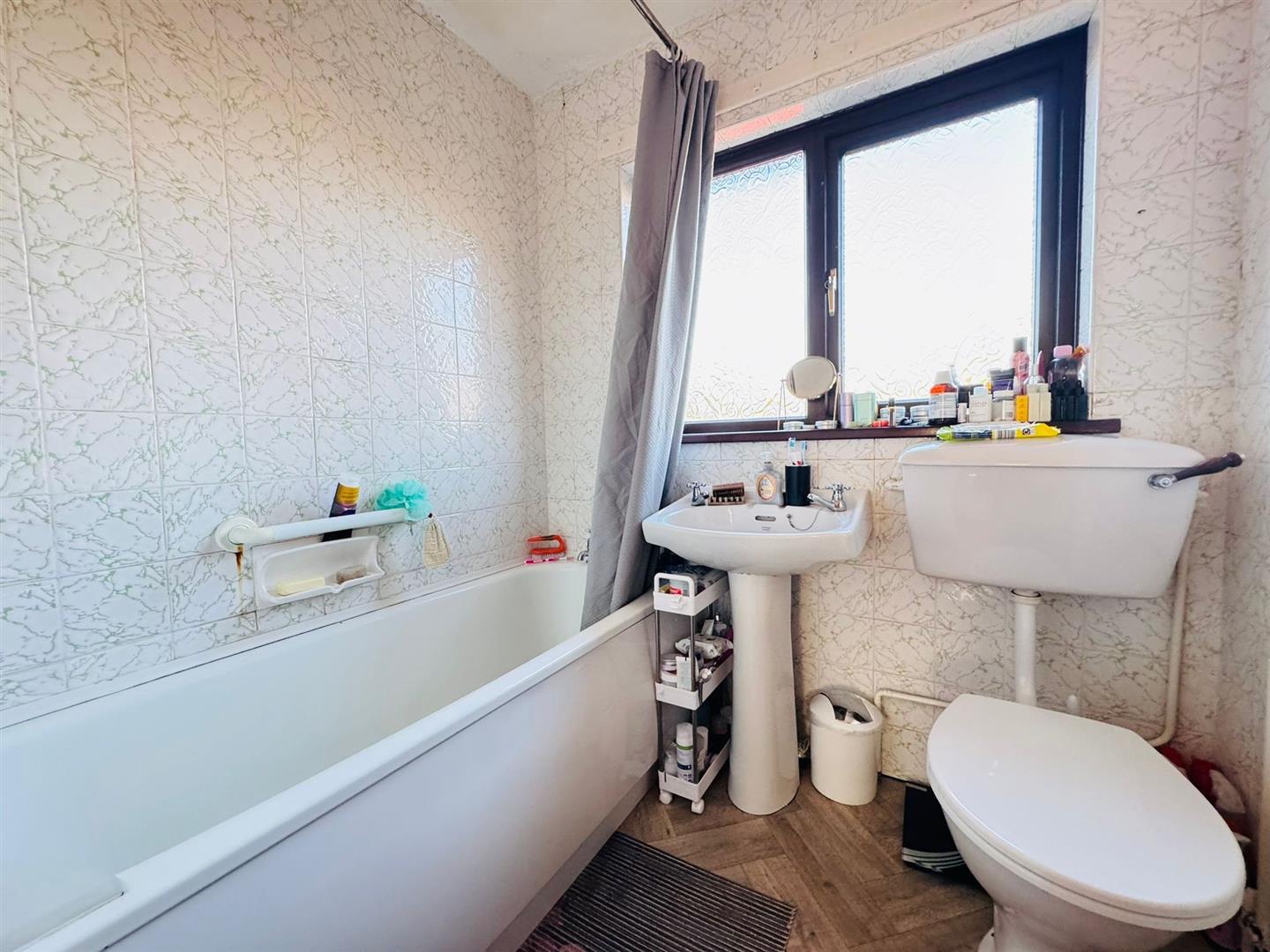 White suite comprising panelled bath, pedestal wash hand basin, low flush wc, fully tiled walls, radiator.