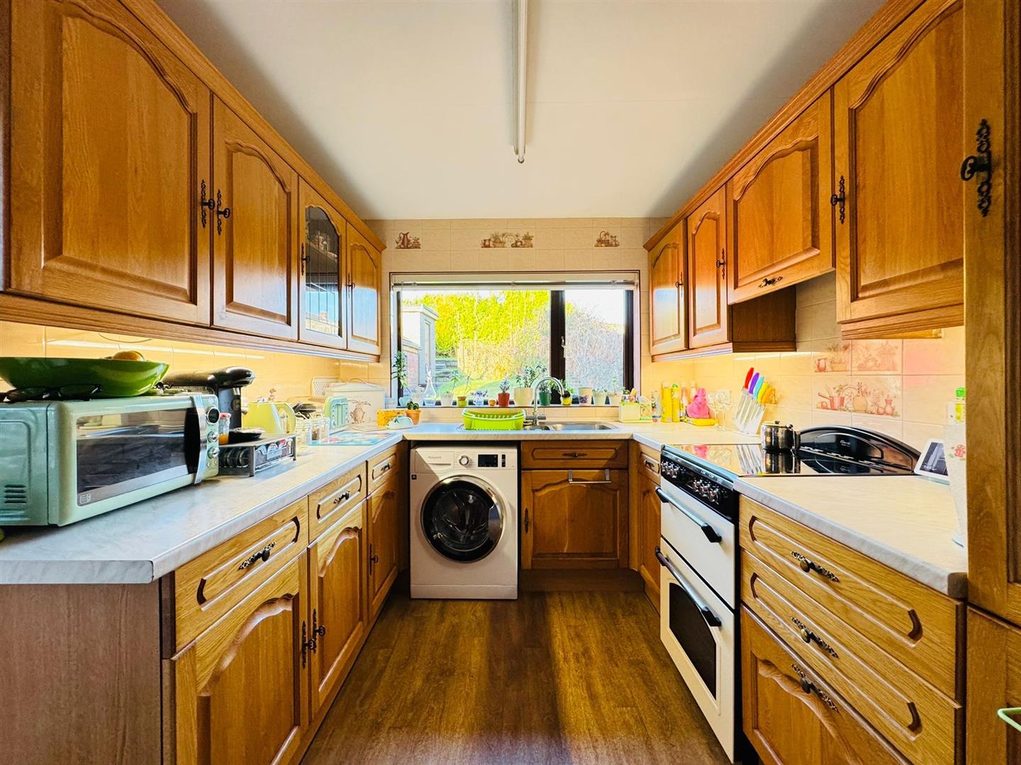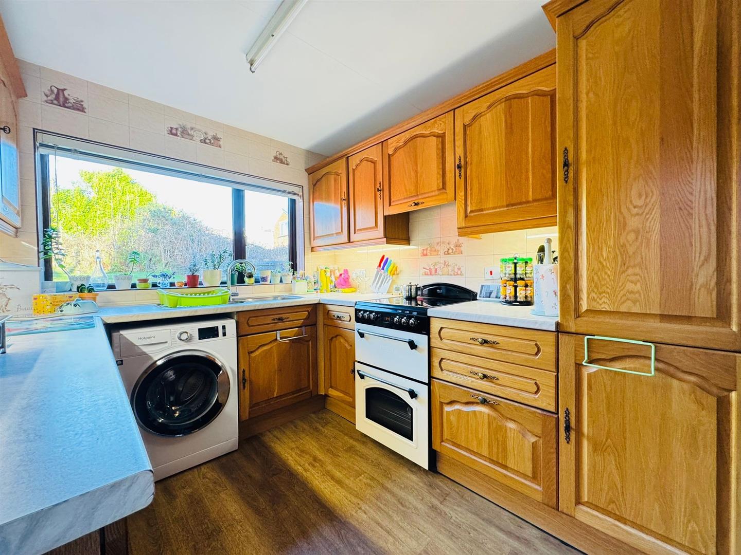Range of high and low level units, formica worktops, basin and a half stainless steel sink unit, cooker space, extractor fan, fridge / freezer space, plumbed for dishwasher, partly tiled walls, radiator, pvc double glazed back door.