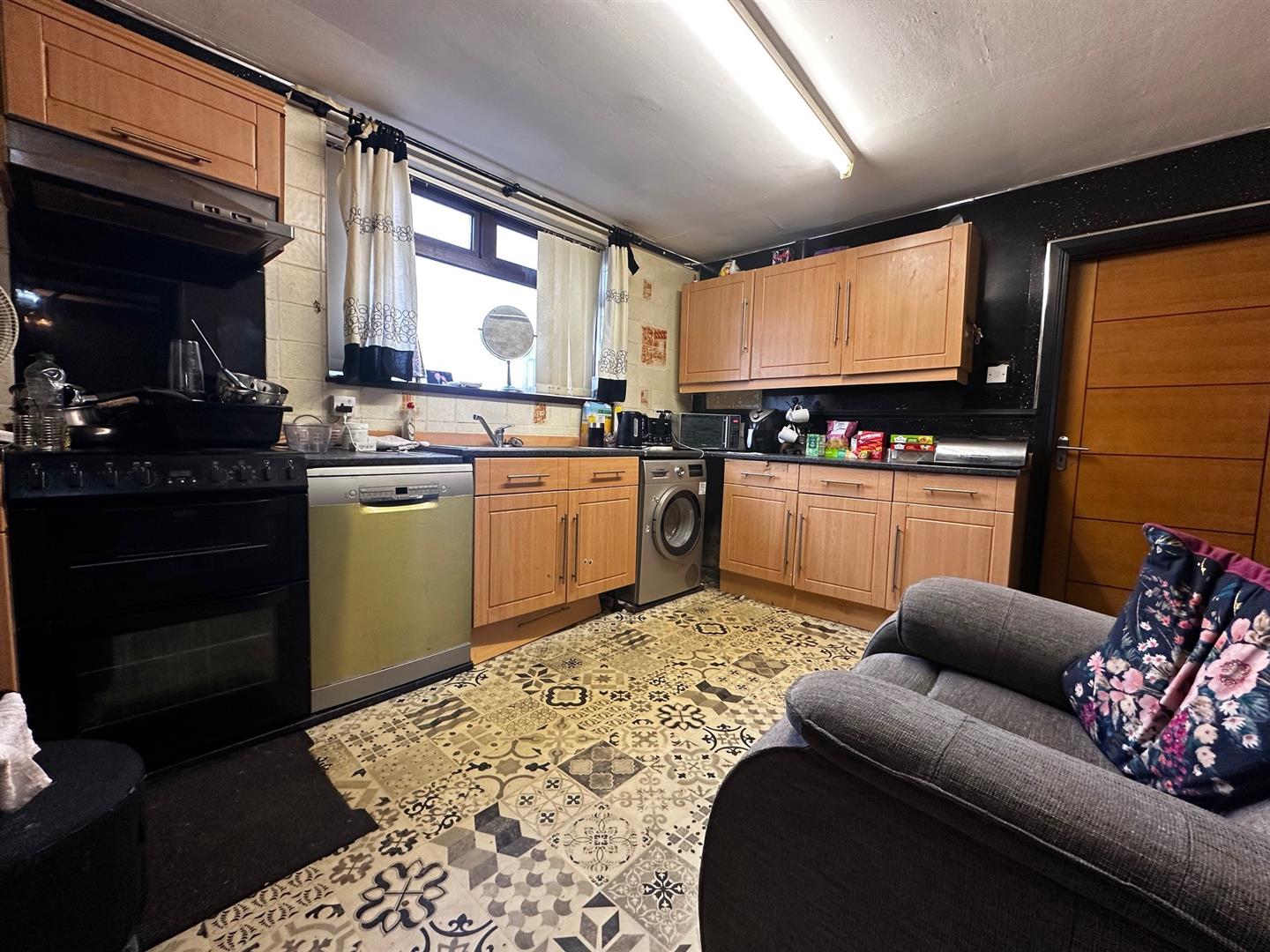 Fridge / freezer space, access to downstairs W.C. Pvc double glazed back door.