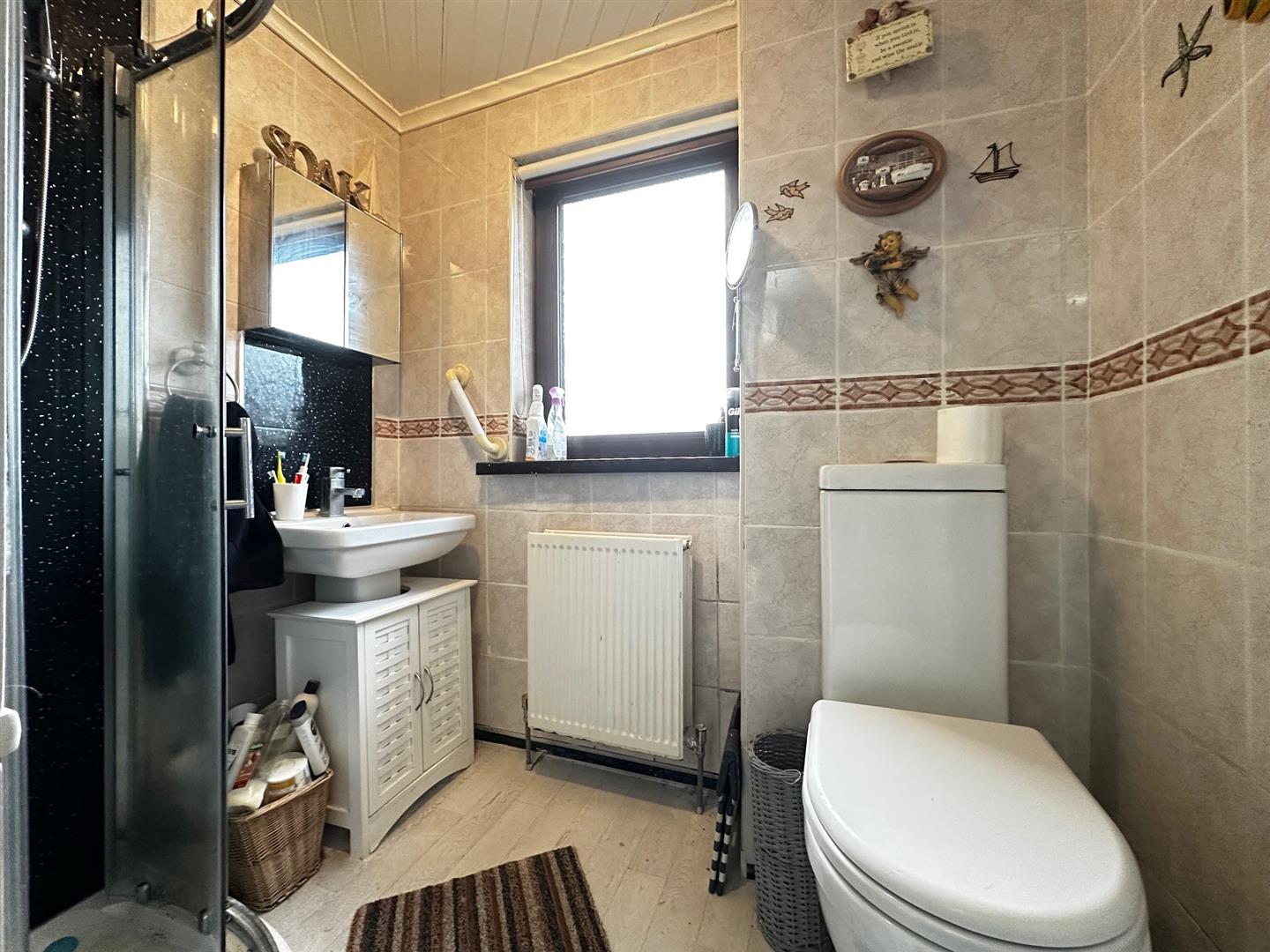 Chrome corner shower cubicle with electric shower, pedestal wash hand basin and low flush W.C. Partly tiled walls, radiator.