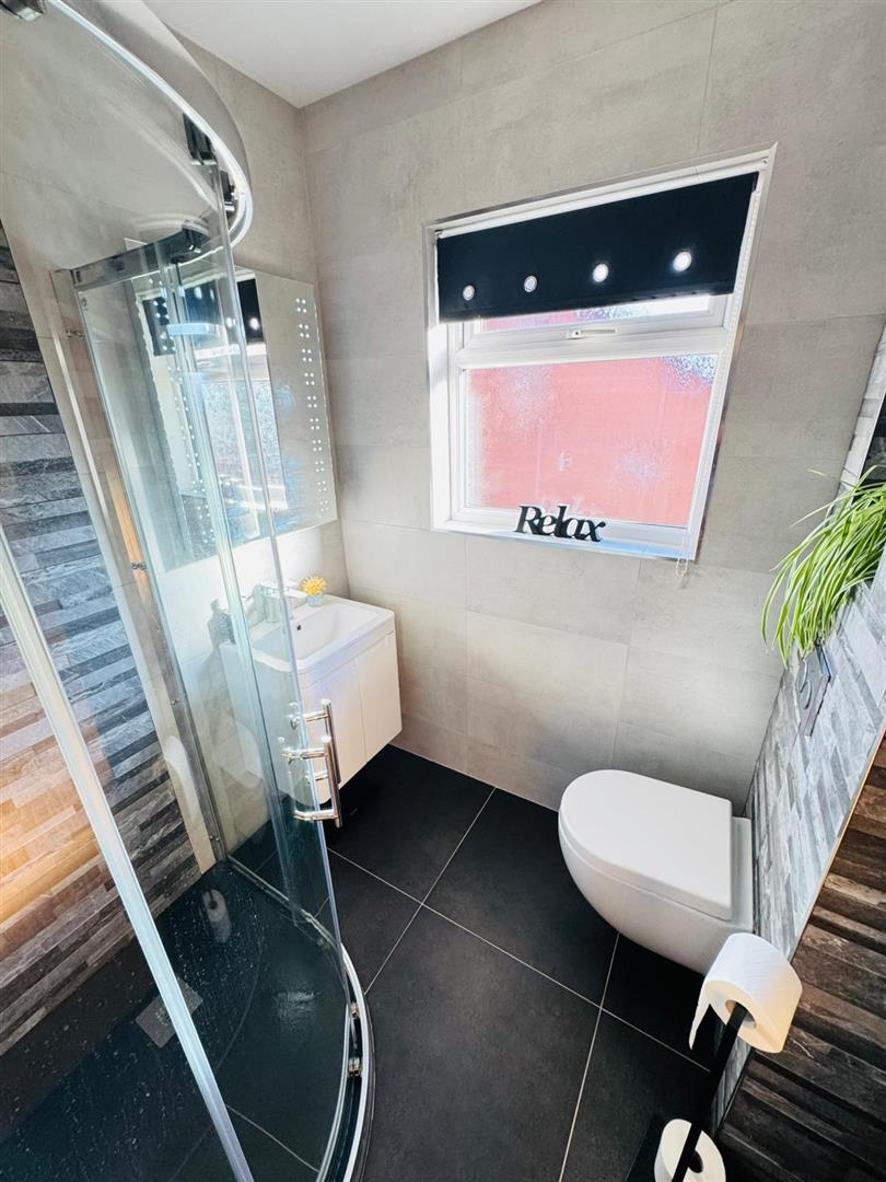 Pvc double glazed front door, solid oak flooring, radiator, access to roofspace via slingsby type ladder, recessed spotlights, built in storage cupboard