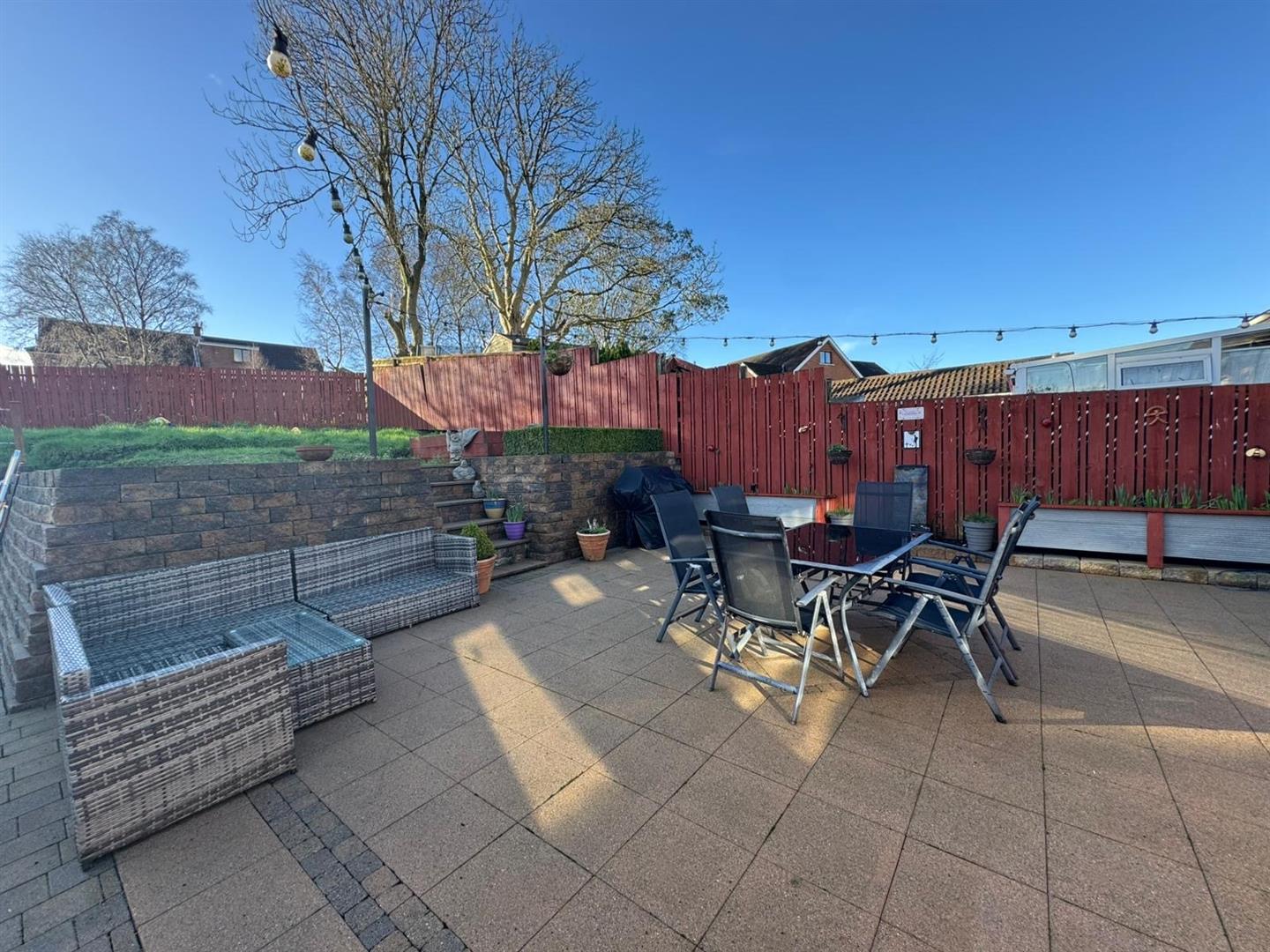 Fully enclosed garden to rear with patio aera and raised lawn area