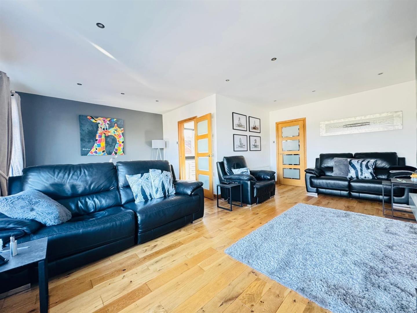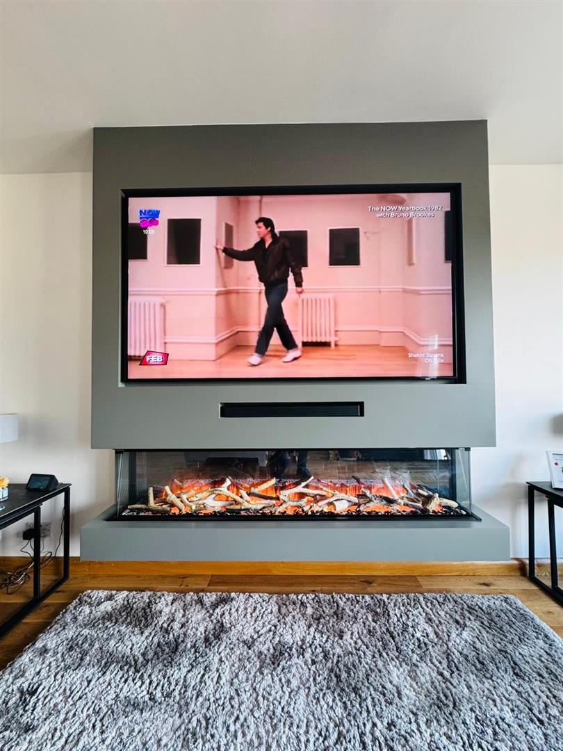 Feature media wall with floating fire, solid oak flooring, three radiators, superb views towards Carntall hills