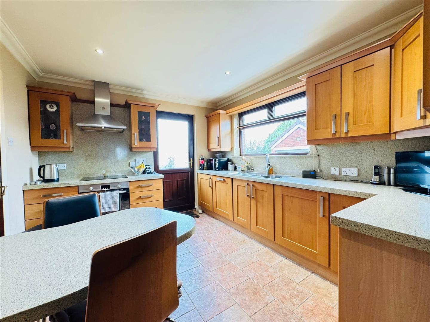 Range of Beech high and low level fitted units with Corian worktops and matching upstands. Basin and a half stainless steel sink unit, built in stainless steel under oven, ceramic hob and stainless steel extractor fan. Integrated washing machine, dishwasher and fridge, glazed display units, breakfast bar, radiator, pvc double glazed door to side.