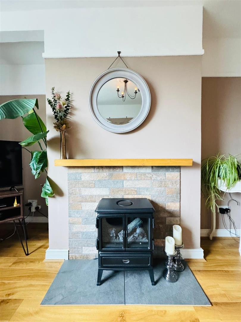 Feature tiled fireplace with mantle. Wood laminate flooring, radiator.