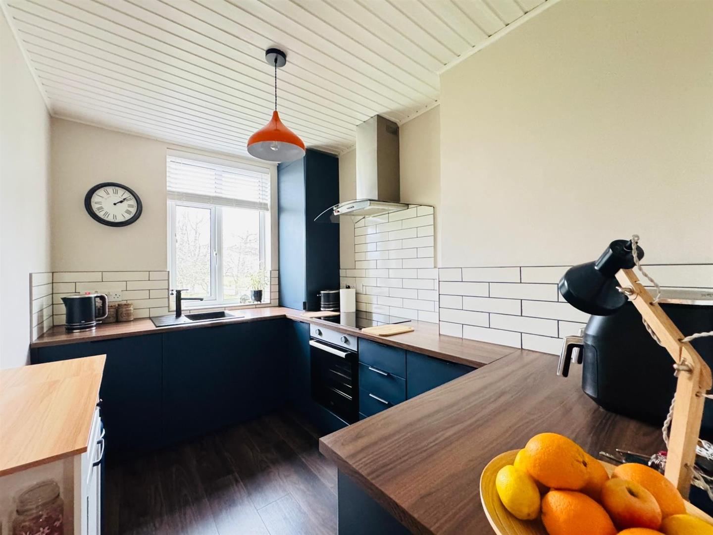 Luxury range of high and low level fitted units with Formica worktops. Single drainer sink unit, built in stainless steel under oven, ceramic hob and stainless steel extractor fan. Integrated fridge and washing machine, storage cupboard with gas boiler. Partly tiled walls, wood laminate flooring.